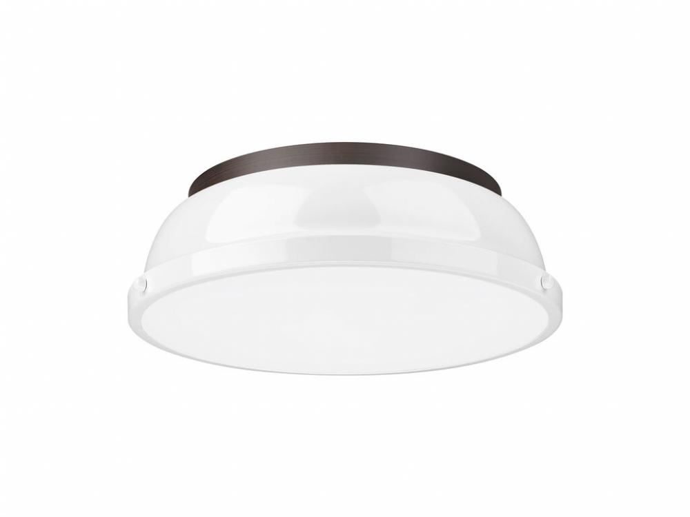 Bring farmhouse elegance into your home with the Yep by Golden Lighting Duncan 2-light Flush Mount. Featuring a metal shade and a rubbed bronze frame, it creates a welcoming atmosphere. The smooth white metal shade provides excellent light reflection with its enamel-like high-gloss sheen, enhancing the fixture's timeless utility style. The rubbed bronze finish brings warmth and depth, perfectly complementing various design themes from traditional to industrial. Ideal for low ceilings in hallways, closets, laundry areas, and bathrooms, this fixture is damp location rated for covered and semi-enclosed spaces with occasional moisture. It requires two E26 medium base bulbs (not included), with a maximum wattage of 60 per bulb. Overall dimensions are 14"W x 4.25"H x 14"D, making it a compact yet illuminating addition to your home. Close with the lifestyle appeal of classic farmhouse charm and quality craftsmanship.
