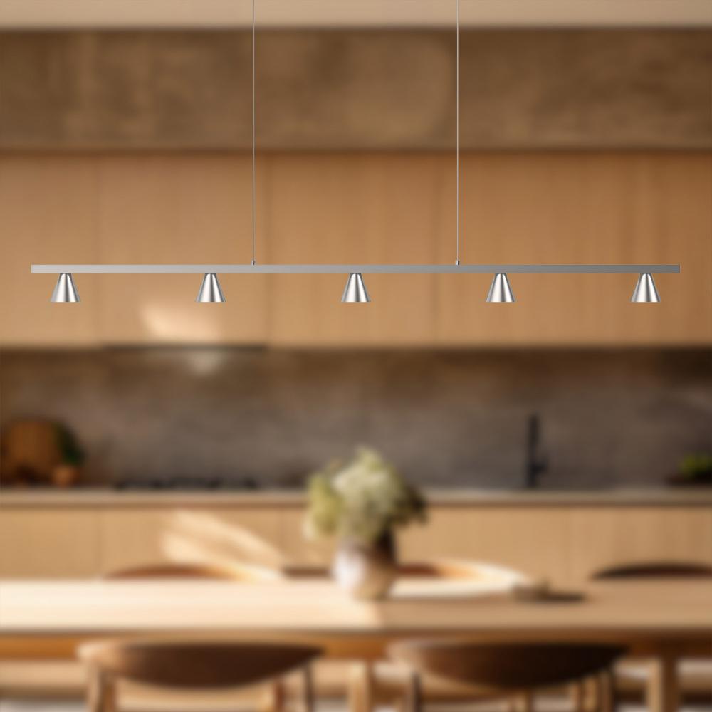Multiple aluminum cones are connected inline and direct light downwards from the geometric linear pendant. The Dune series utilizes classic minimalist lamp shapes yet in reduced scale to elegant effect. The LED spot sources are focused by diminutive reflectors housed within the exquisitely turned shades. Available in multiple configurations and finishes.