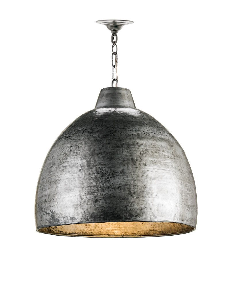 A unique hammered blackened steel finish gives this classic dome style fixture a cool industrial look. But it’s the golden glow on the interior of the Earthshine Pendant that brings the warmth of sunlight to a space. Made of wrought iron, this sturdy pendant will turn on its earthy good looks to illuminate an urban oasis or an edgy-cum-modern city loft.