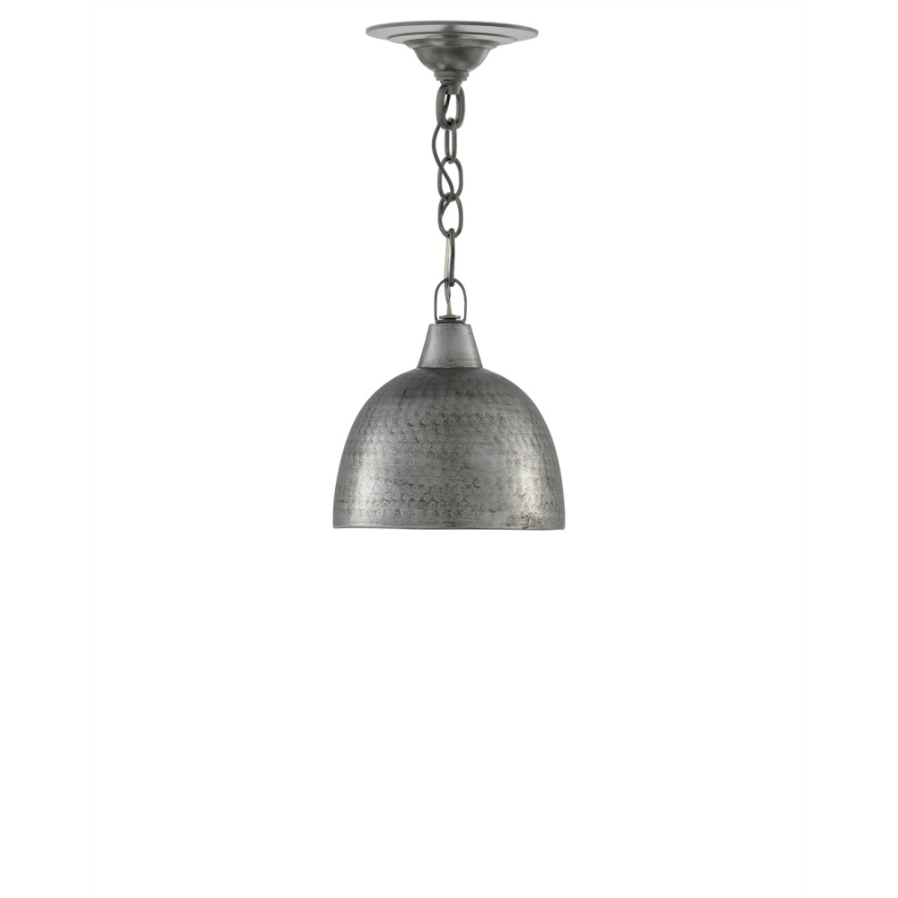 The Earthshine Steel Small Pendant has a hammered dome shape for a cool industrial look. Made of iron in a blackened steel finish, this sturdy silver pendant has a luminous glow on the interior. Adjustable from 14" to 84" with use of included chain/rod kit/cable. If your space calls for a longer drop, additional chain/rods/cable is available for purchase.