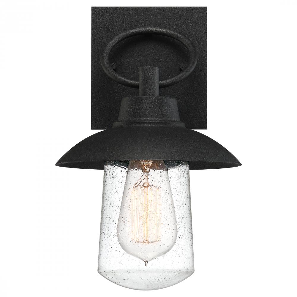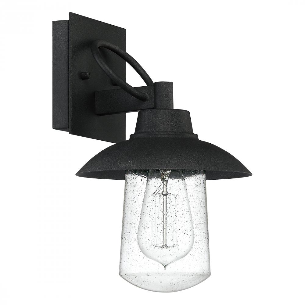 The East Bay is a transitional style that features a tapered roof and oversized ring accent. The seedy glass shade softly diffuses light while the mottled black finish effortlessly complements the façade of any exterior.
