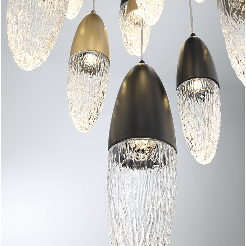 Drawing inspiration, straight from nature, the Écrou collection showcases large hand blown glass shades reminiscent of large acorns. The clear glass highlights a detailed wood grain texture that is combined with your choice of matte black, matte gold, or a mix of both finishes for a stately, stylized piece. For further illumination options, this collection uses compatible LED lamping