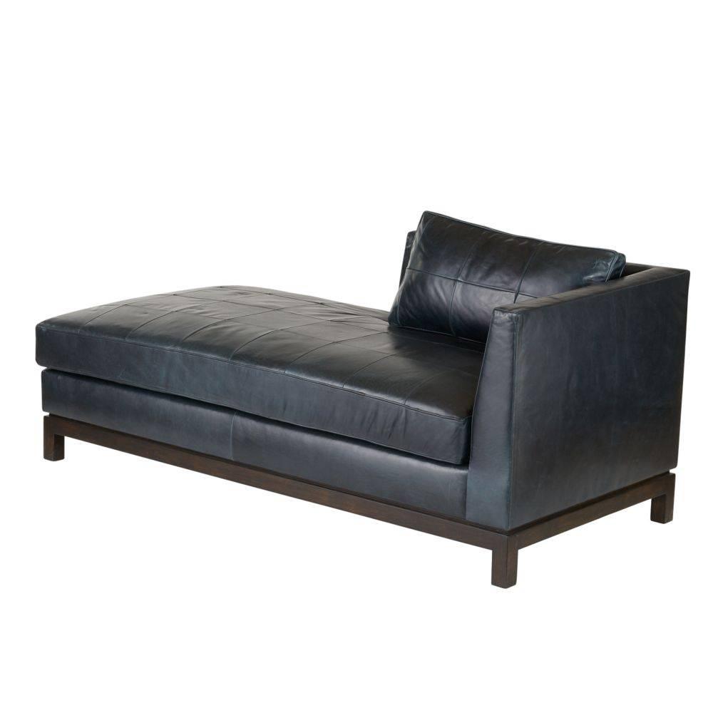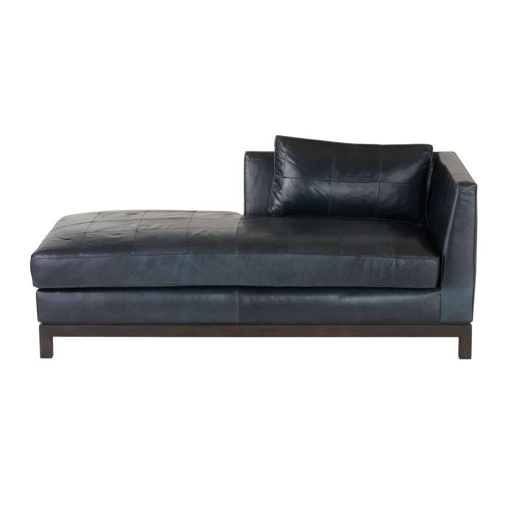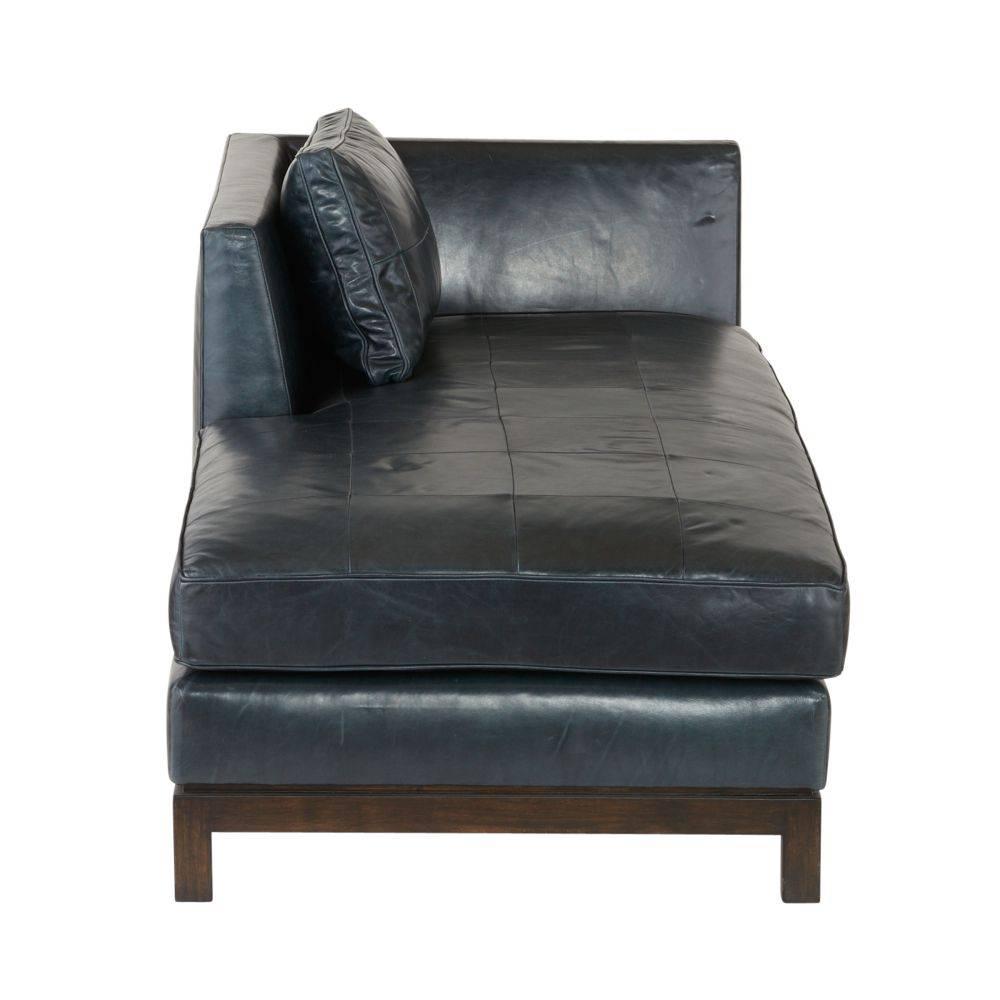 Our sophisticated chaise of ink leather was inspired by mid-century proportions, updated for a modern age. Its buttery soft cushion and pillow are patchworked for visual interest, as the differing tonality of the leather adds subtle dimension. Mounted on a sturdy rectangular base with block legs of grey ash wood. Leather will vary.