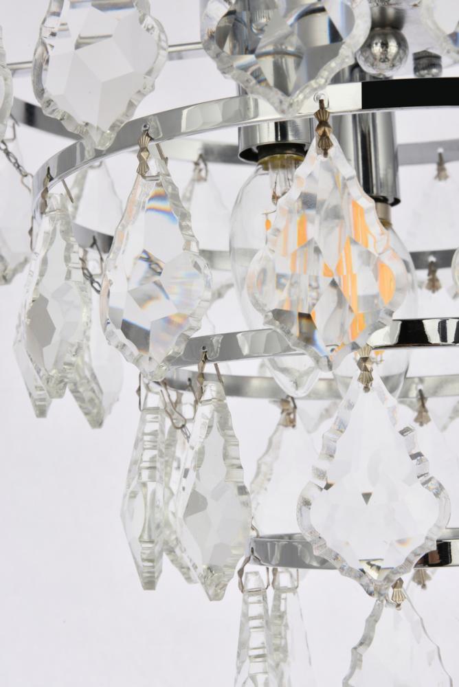 Tiers of clear multi-faceted crystals reflect the soft glow of candelabra bulbs