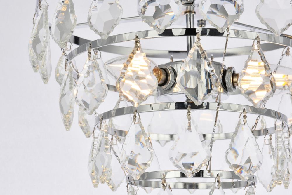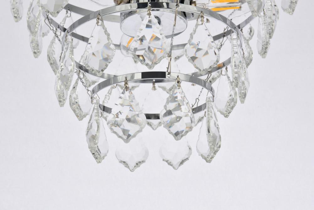Tiers of clear multi-faceted crystals reflect the soft glow of candelabra bulbs