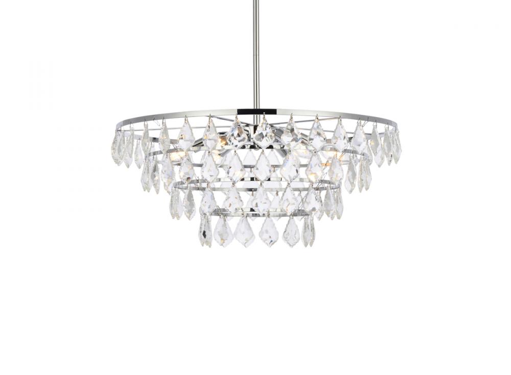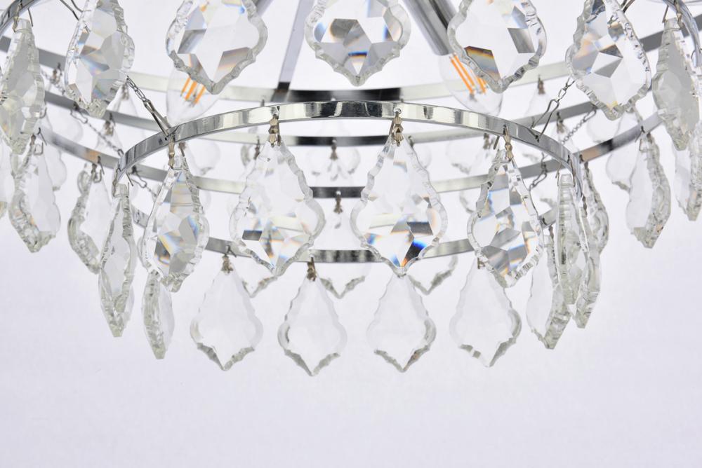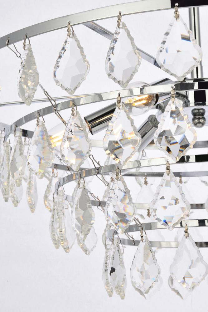 Tiers of clear multi-faceted crystals reflect the soft glow of candelabra bulbs