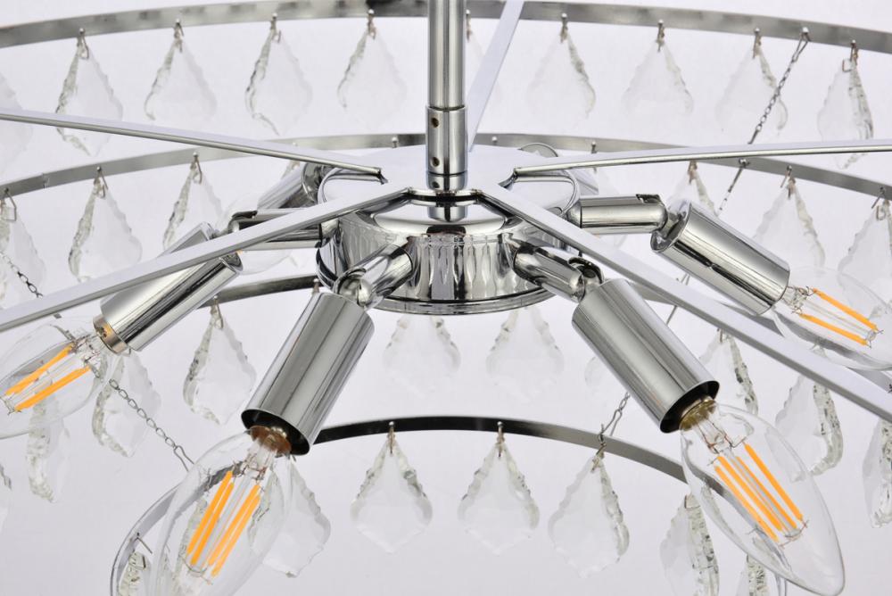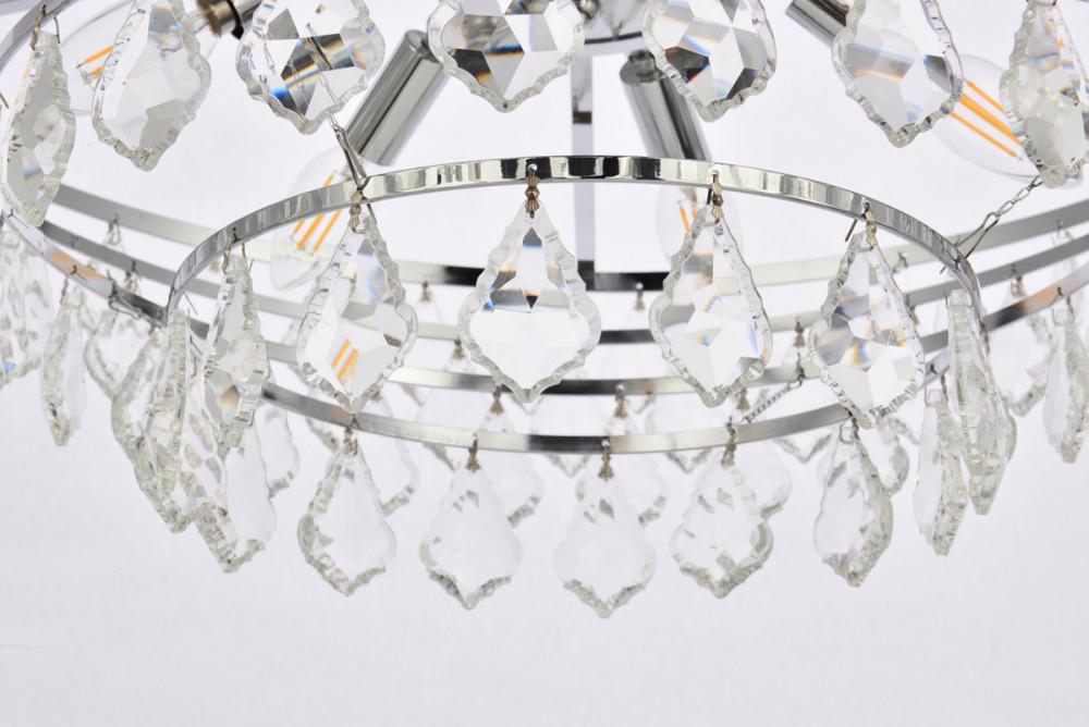 Tiers of clear multi-faceted crystals reflect the soft glow of candelabra bulbs