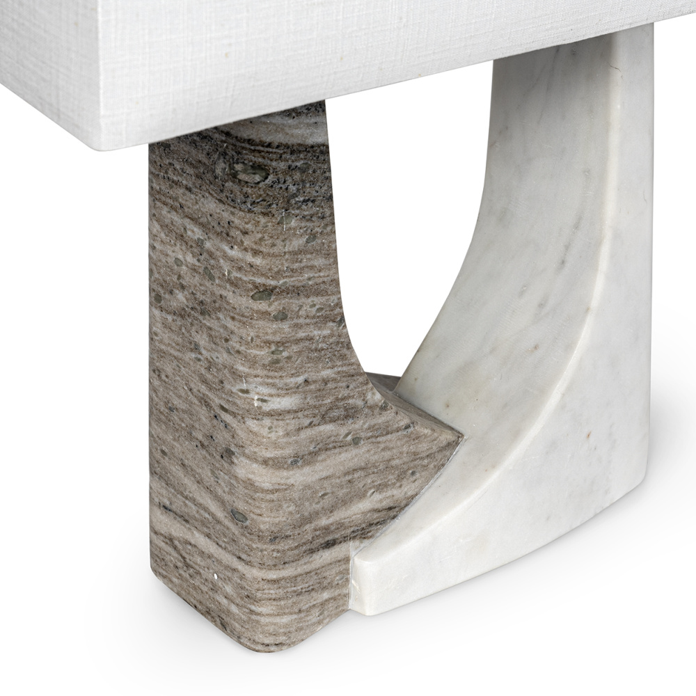 Marble slabs hand carved, polished and seamlessly fixed together creating a combination of grey, cream and white two toned base topped with a white linen rectangular shade. Marble is a natural material and will vary in color and grain, no two pieces will