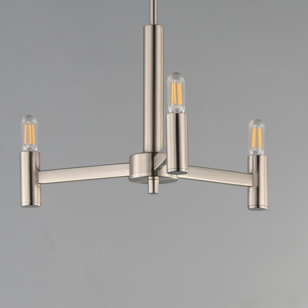 Straight extensions of rectilinear arms emanate from a cylindrical center housing in this transitional design. The candelabra is made in a corresponding cylindrical form playing into the geometries of this streamlined chandelier design. Available in a text