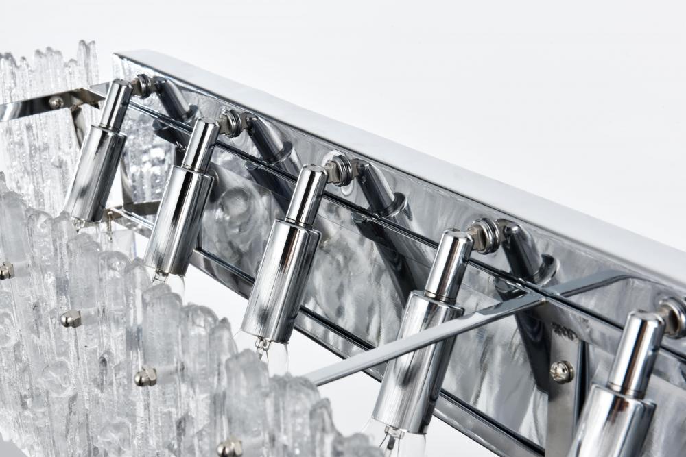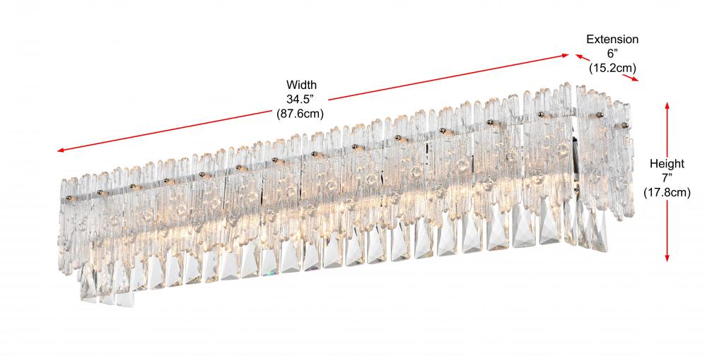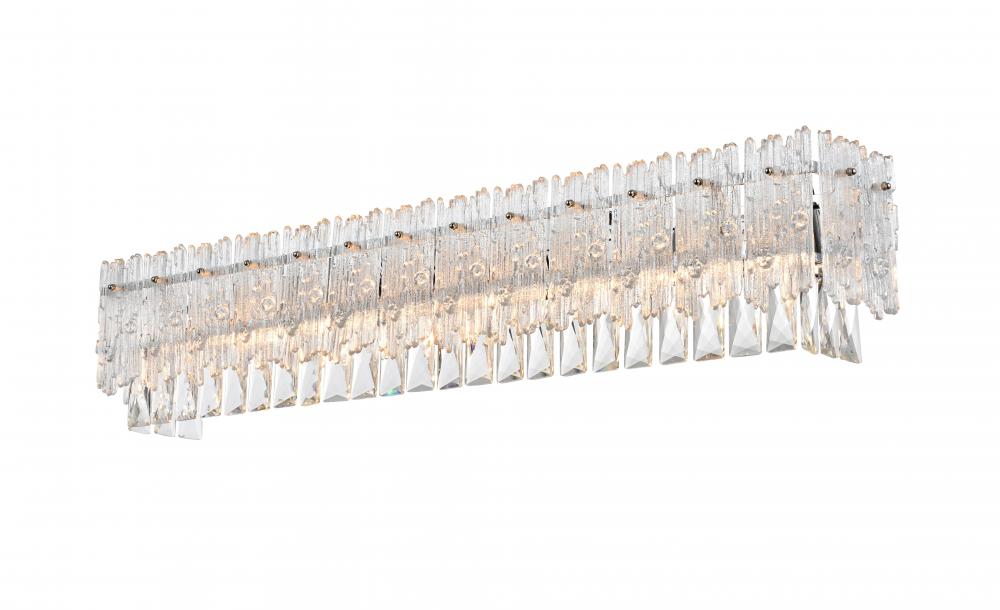 Transform your home with the opulent charm of this indoor lighting, meticulously designed to make a statement in any space. The light fixture showcases an intricate array of precision-cut clear crystals, each expertly faceted to maximize light refraction and create a dazzling display of brilliance. These crystals are complemented by textured glass accents that add depth and visual interest, casting a soft, shimmering glow across the room. Available in your choice of chrome or satin gold finishes, it is the epitome of luxury and modern elegance. As part of a coordinated collection, it also includes matching chandeliers, wall sconces and flush mounts, allowing you to create a harmonious lighting scheme throughout your home.