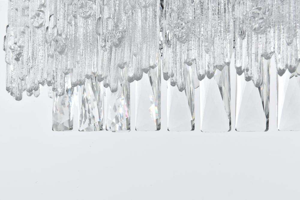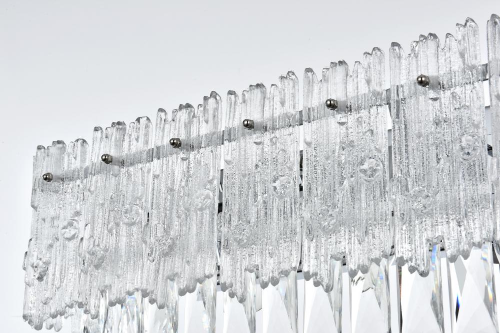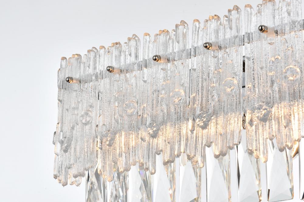The combination of clear crystals and textured glass creates a sophisticated light play, perfect for setting an elegant mood.