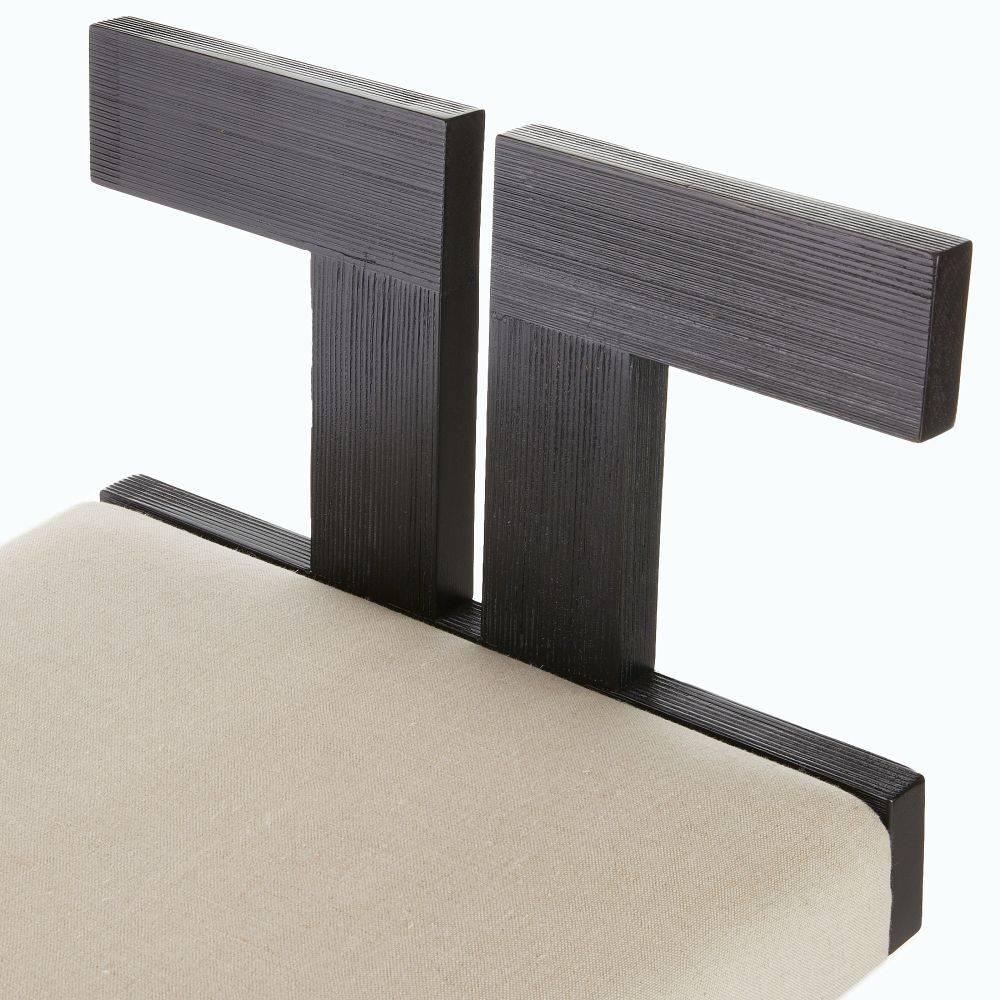 A modern mix of ’70s American design with Zen architecture, this elegant stool has an Eastern appeal. Crafted of ribbed beech wood stained in ebony, the split back is accented with antique brass studs at very center. A padded seat of natural linen adds style and comfort.