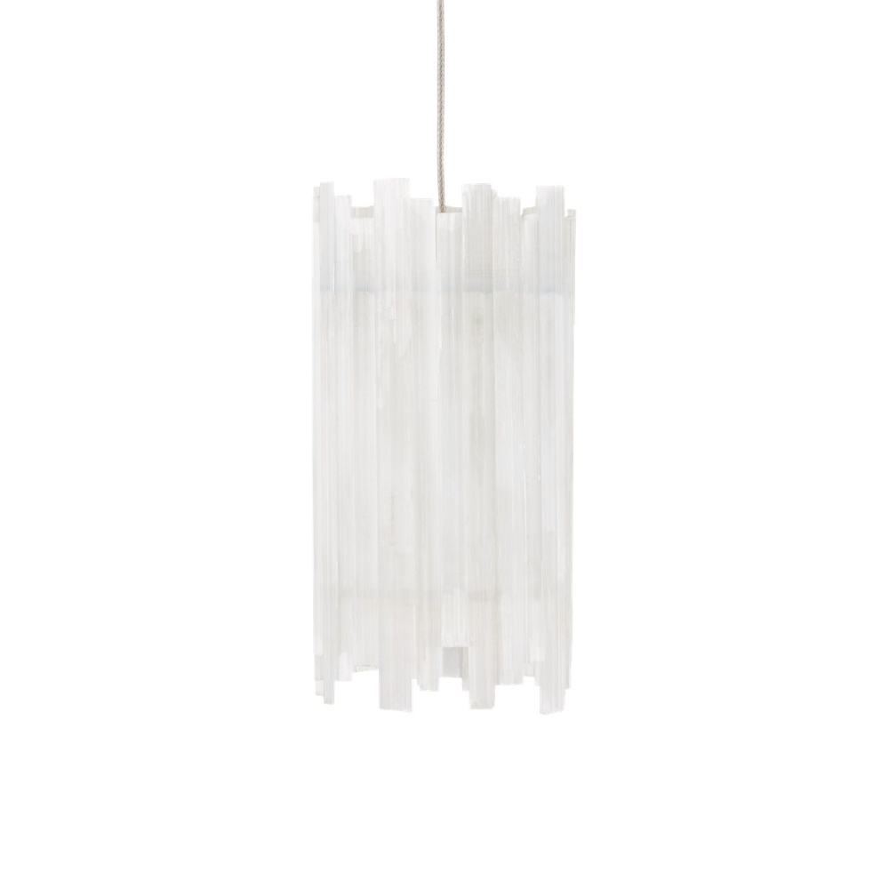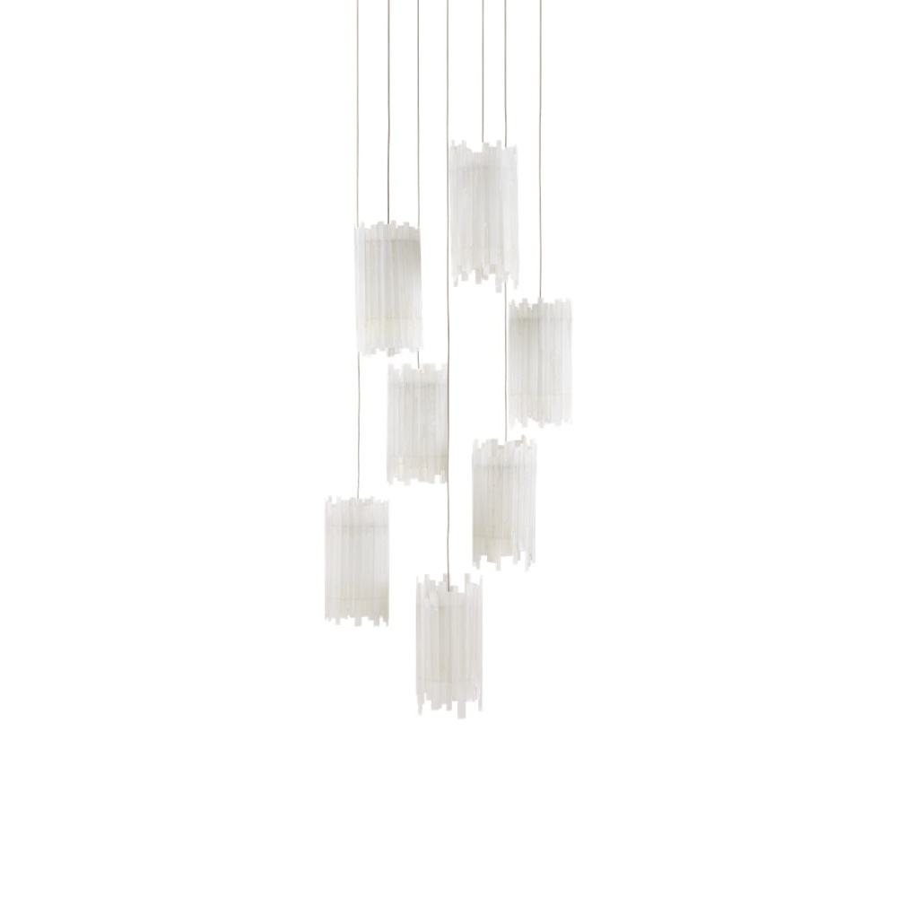 The Escenia 7-Light Multi-Drop Pendant has shades made of natural selenite. The ribs of the essential natural material are staggered top and bottom, which brings the shape of the shades added interest. When the lights are switched on, a beautiful glow is created by the crystal bars. The canopy of this piece is luminous in a painted silver finish. This fixture is among Currey & Company's multi-drop pendant collection, which includes multiple configurations.