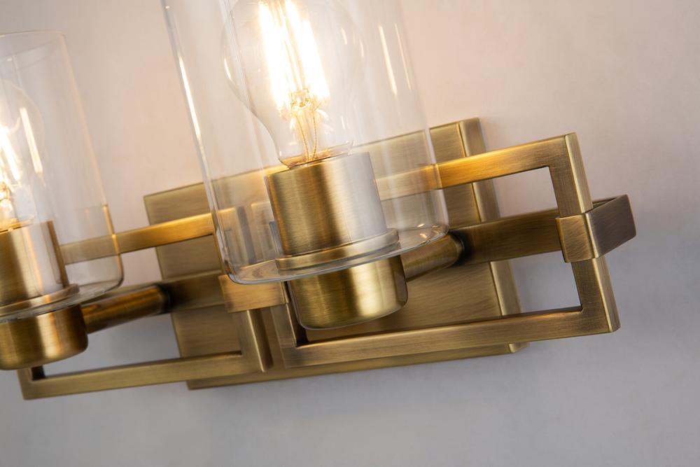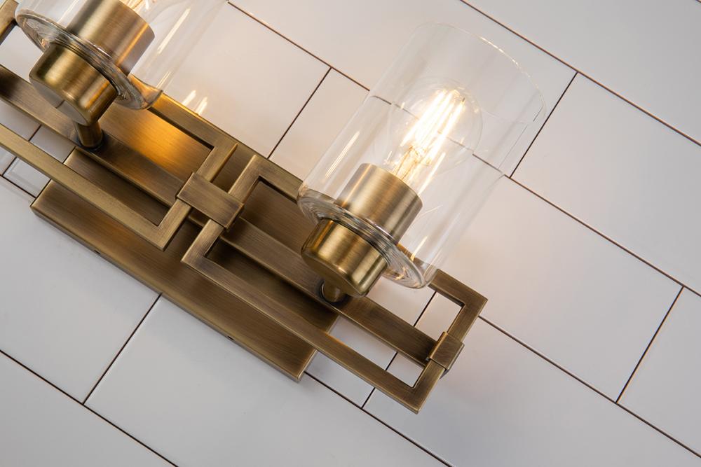 A 15" vanity light in brushed aged brass with rectangular lines and two curved cylinder shades. Mounts up or down, ideal for over-mirror use with mid-century charm.