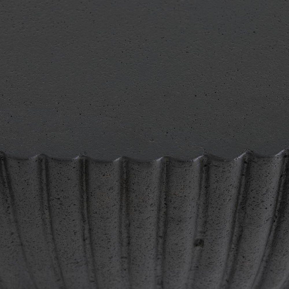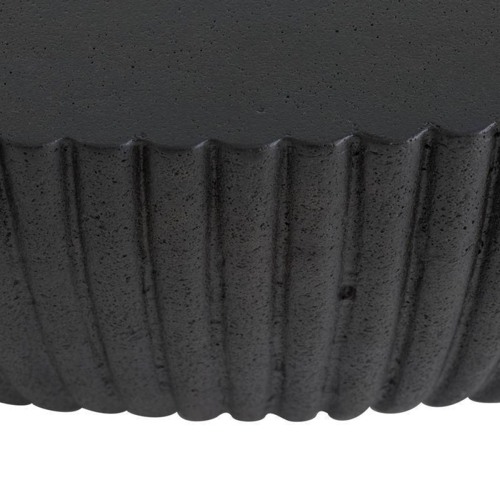 The low profile of this simple drum table style is equally at home in a contemporary outdoor room or a more transitional space, formed of black concrete composite with fluting details tapering down to a bronze stainless-steel base.