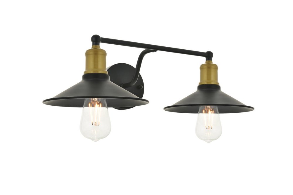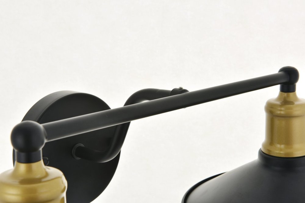 Two-toned brass and black finish 2-light wall sconce with a curved arm and cone shaped shade