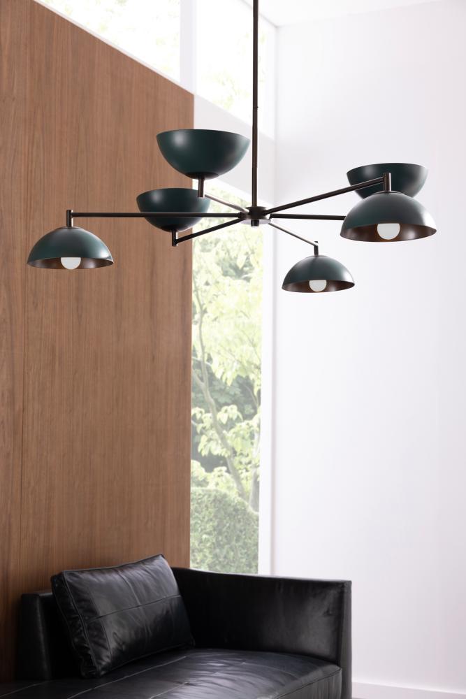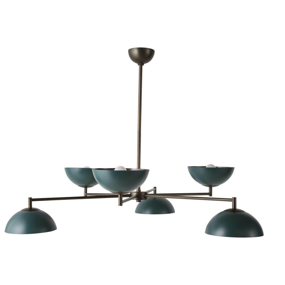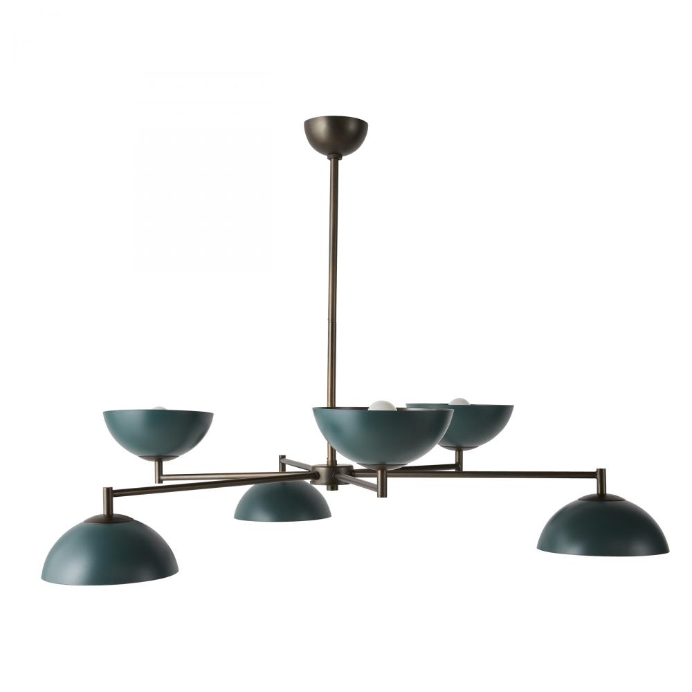 Powder coated in a deep Aegean hue, a modernist style of steel adds a pop of subtle color to your space. Suspended from a slim English bronze-plated steel canopy and pipe, the colorful plates angle both upwards and downwards to create a warm, even glow.