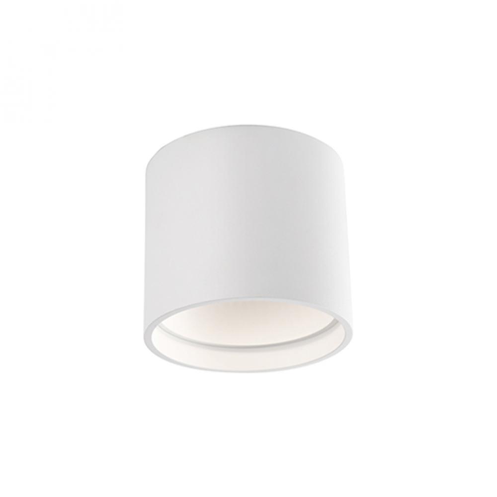 LED flush mount made from heavy gauge cast aluminum painted white or black, round cylinder shaped. Shines through a high-precision optical lens down into the room.