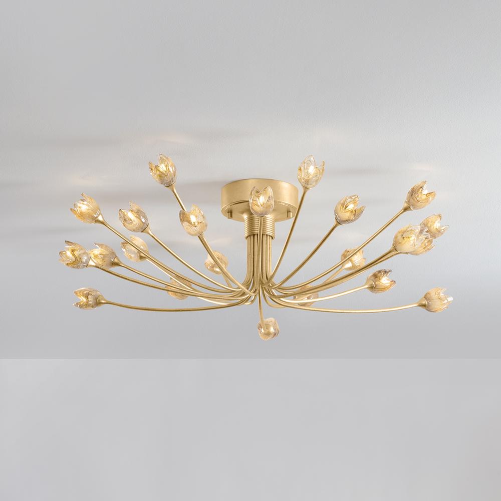 The sprawling stem-like arms and petite champagne piastre glass shades of Falkirk extend like delicate snowdrops in bloom. A Vintage Gold Leaf framework supports this whimsical close-to-ceiling fixture, adding a glamorous note. Available in two sizes, Falkirk creates a fresh, inviting statement overhead.