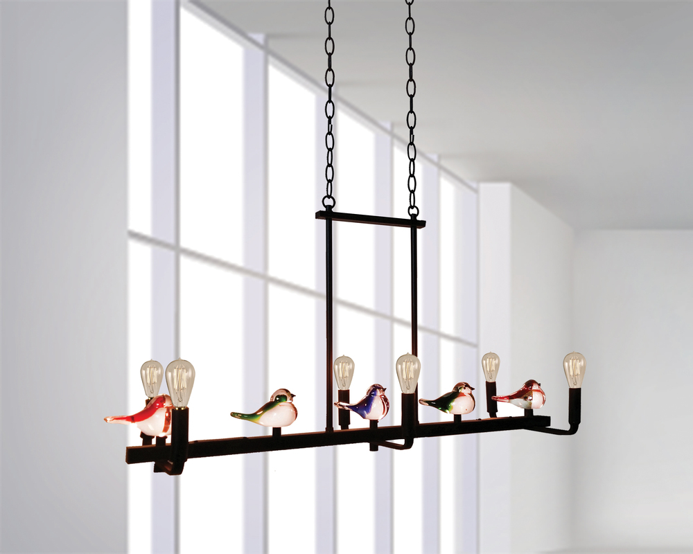 Our charming Finch Hanging Fixture is a wonderful marriage of form and function that will delight both young and young at heart. The whimsical fixture features an elongated center cross bar. 5 colorful finches are perched along the bar, each is hand blown using Favrile art glass that begins with a clear body that is highlighted with red, green, blue and amber. The Favrile process embeds the color within the glass, which allows for subtle variations in color and texture. This ensures that no 2 pieces are exactly alike. The birds are flanked by a series of 6 LED bulbs (bulbs included) that are encased in traditional incandescent bulb covers. Each bulb has a life expectancy of approximately 50,000 hours to provide you with many years of energy efficient, worry free lighting. The fixture hangs from a metal rectangular ceiling canopy, dual chains and support tubes, all finished inn burnished Oil Rubbed Bronze. A perfect way to light an elongated dining table, game table or kitchen island, our Finch Hanging Fixture is a must have for the bird lover.