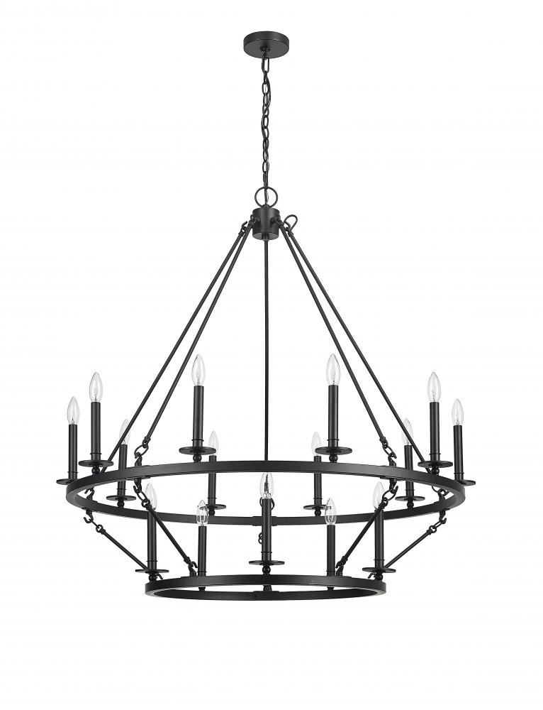 The Florence Collection is chandelier lighting designed on a grand scale that fits any ample space. The two-tiered fixture is suspended by perfectly symmetric rods equipped with 15 candle lights for a dramatic effect. Finished in classic matte black, the design profile is simple yet sophisticated and perfect for great rooms and dining areas with soaring ceilings.