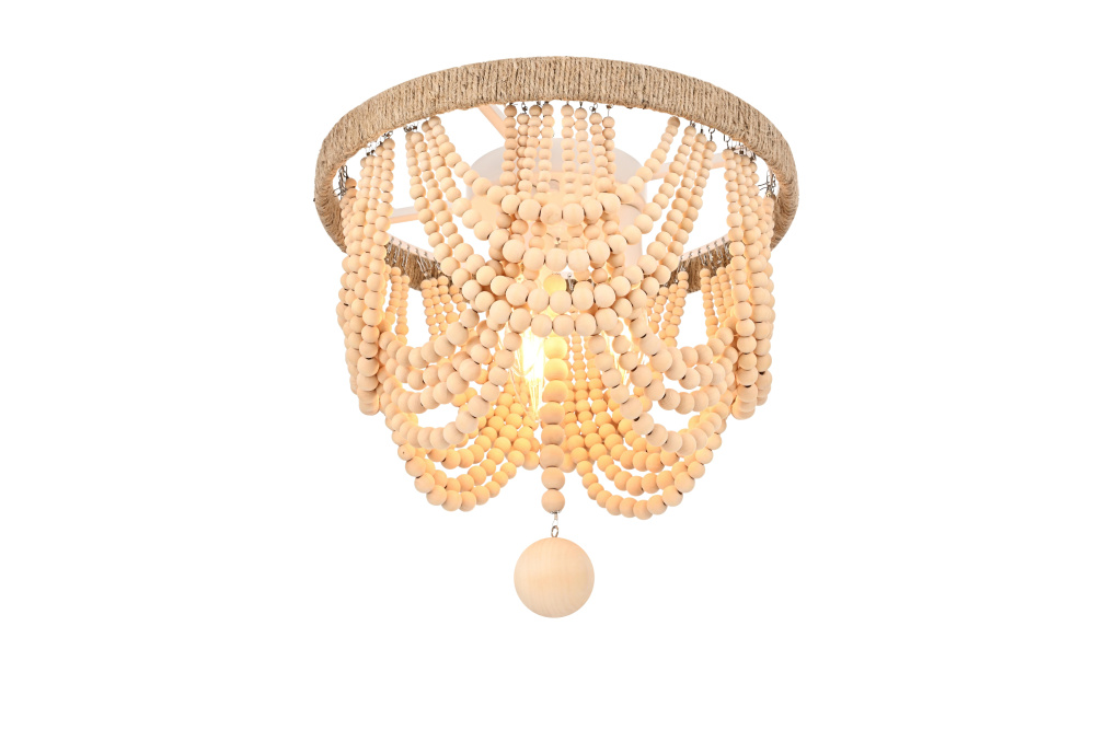 Transform your ceiling with this extraordinary semi-flush mount that reimagines traditional beaded chandelier design for modern spaces. The ingenious combination of a rope-wrapped crown and meticulously arranged wooden bead swags creates a stunning interplay of texture and form. Each tier of beads is thoughtfully positioned to create graceful scallops that catch and filter light in captivating ways. The substantial wooden finial anchors the design while adding an extra touch of artisanal beauty. Perfect for spaces where a traditional chandelier might overwhelm, this fixture brings all the drama of suspended beadwork while maintaining a practical ceiling-hugging profile. The iron framework provides sturdy support while remaining discreet, allowing the natural beauty of the wooden beads to take center stage. Whether styled in sophisticated antique white or warm natural beige, this fixture adds instant character to dining rooms, bedrooms, or entryways. The thoughtful blend of materials and textures creates a piece that feels both timeless and fresh, making it an ideal choice for designers and homeowners seeking to create a space with authentic charm and artistic presence.