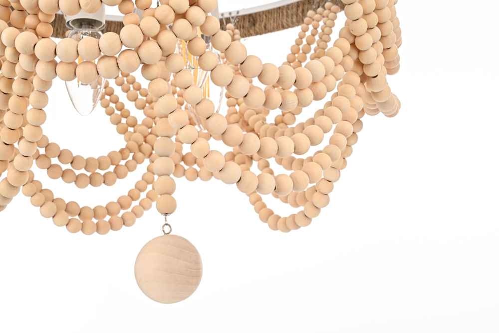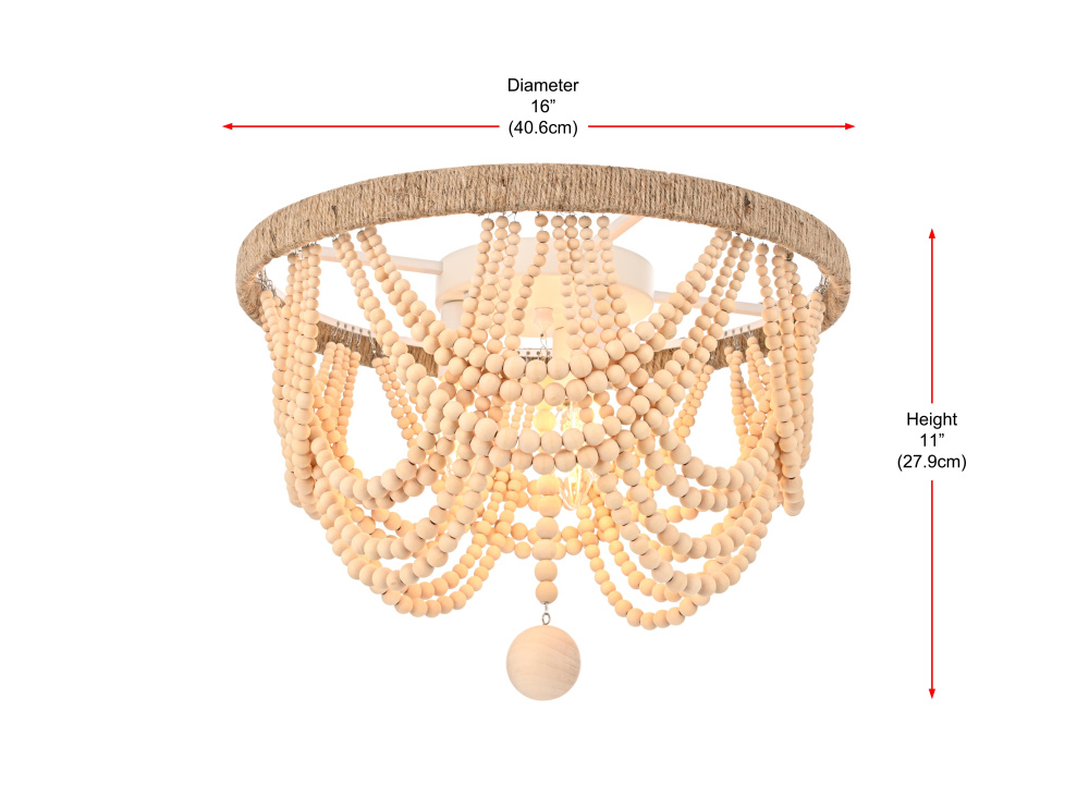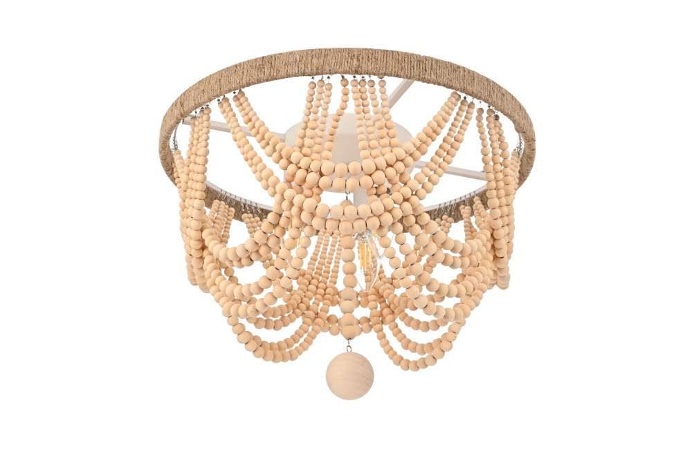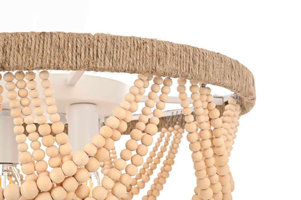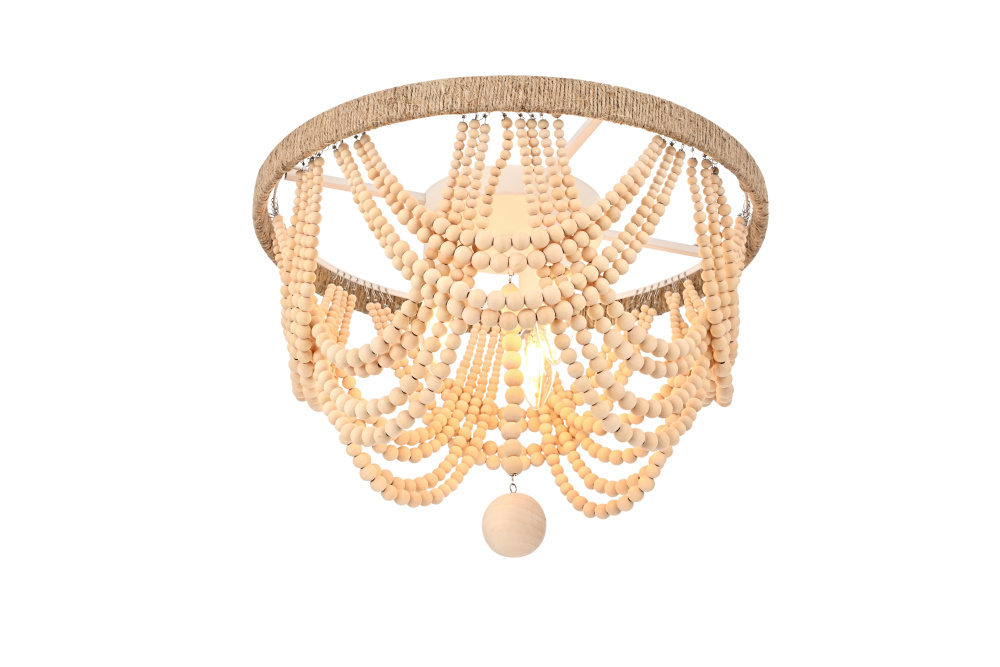 Transform your ceiling with this extraordinary semi-flush mount that reimagines traditional beaded chandelier design for modern spaces. The ingenious combination of a rope-wrapped crown and meticulously arranged wooden bead swags creates a stunning interplay of texture and form. Each tier of beads is thoughtfully positioned to create graceful scallops that catch and filter light in captivating ways. The substantial wooden finial anchors the design while adding an extra touch of artisanal beauty. Perfect for spaces where a traditional chandelier might overwhelm, this fixture brings all the drama of suspended beadwork while maintaining a practical ceiling-hugging profile. The iron framework provides sturdy support while remaining discreet, allowing the natural beauty of the wooden beads to take center stage. Whether styled in sophisticated antique white or warm natural beige, this fixture adds instant character to dining rooms, bedrooms, or entryways. The thoughtful blend of materials and textures creates a piece that feels both timeless and fresh, making it an ideal choice for designers and homeowners seeking to create a space with authentic charm and artistic presence.