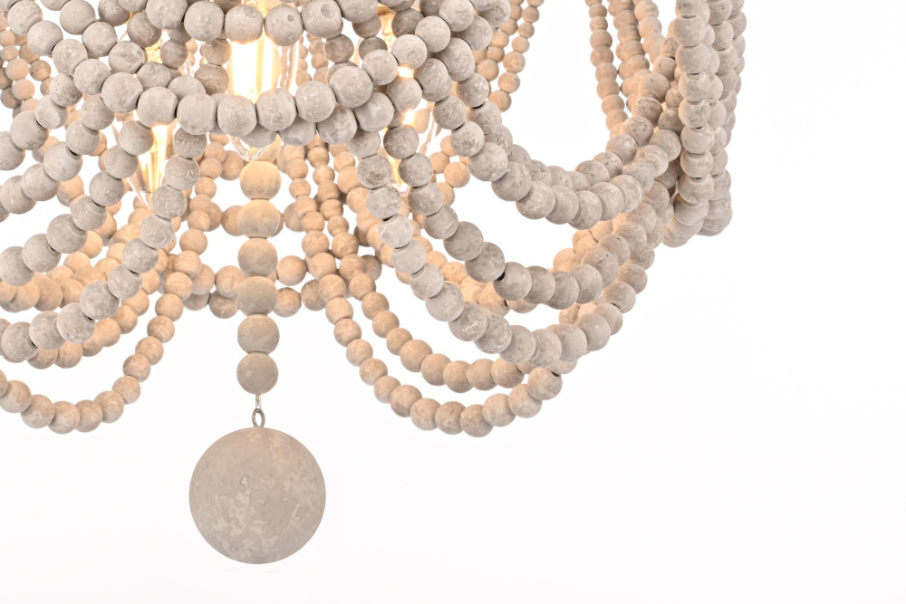 Transform your ceiling with this extraordinary semi-flush mount that reimagines traditional beaded chandelier design for modern spaces. The ingenious combination of a rope-wrapped crown and meticulously arranged wooden bead swags creates a stunning interplay of texture and form. Each tier of beads is thoughtfully positioned to create graceful scallops that catch and filter light in captivating ways. The substantial wooden finial anchors the design while adding an extra touch of artisanal beauty. Perfect for spaces where a traditional chandelier might overwhelm, this fixture brings all the drama of suspended beadwork while maintaining a practical ceiling-hugging profile. The iron framework provides sturdy support while remaining discreet, allowing the natural beauty of the wooden beads to take center stage. Whether styled in sophisticated antique white or warm natural beige, this fixture adds instant character to dining rooms, bedrooms, or entryways. The thoughtful blend of materials and textures creates a piece that feels both timeless and fresh, making it an ideal choice for designers and homeowners seeking to create a space with authentic charm and artistic presence.