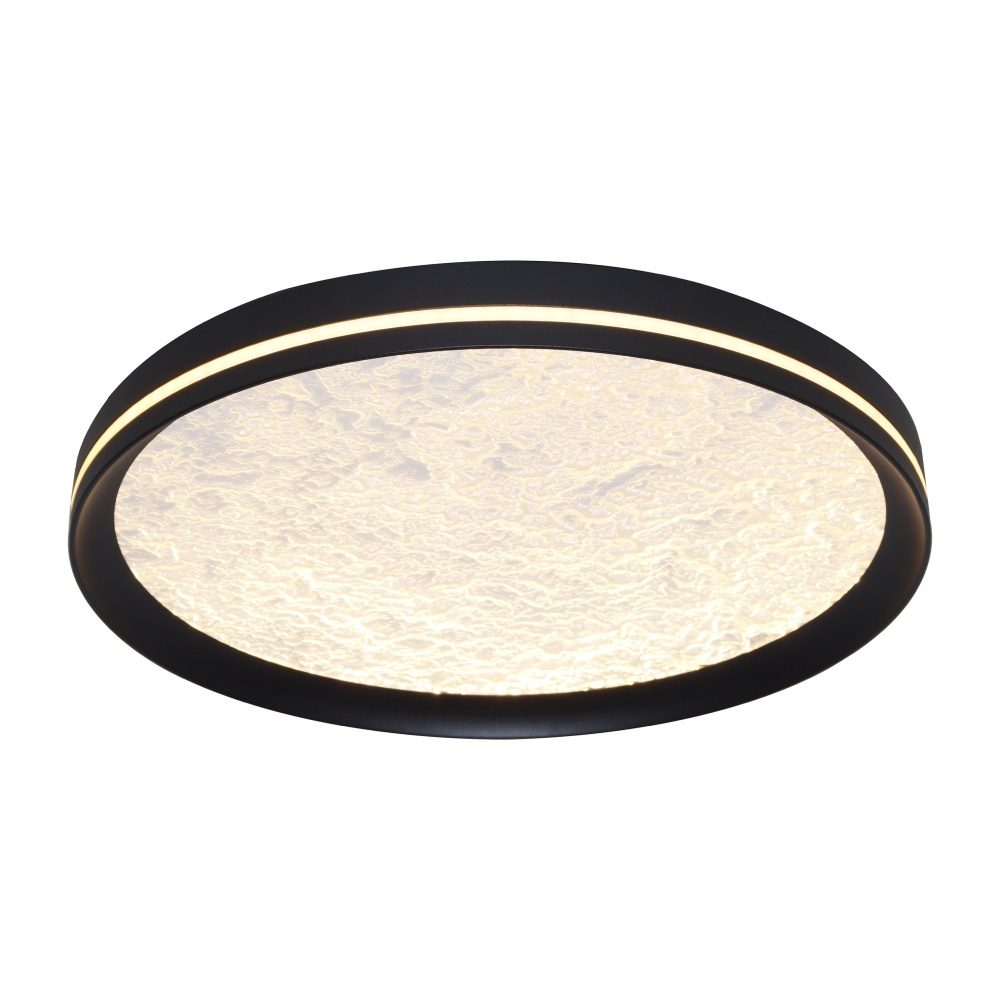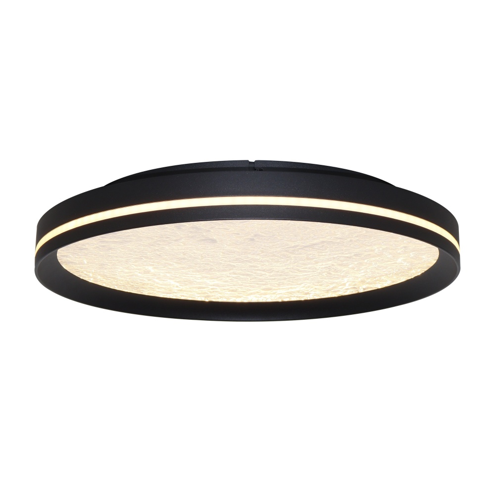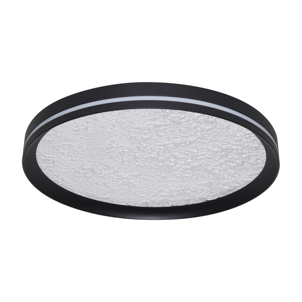 This LED flushmount from the Luna Collection is a celestial masterpiece, blending modern elegance with cosmic allure. Its black frame cradles a textured “moon crater” lens, through which a soft, glittering glow emanates, evoking the magic of starlit skies. A subtle side cutout allows ambient light to gracefully spill onto the ceiling, creating a halo-like effect that transforms any space into a serene sanctuary. The frame of this flushmount is black.