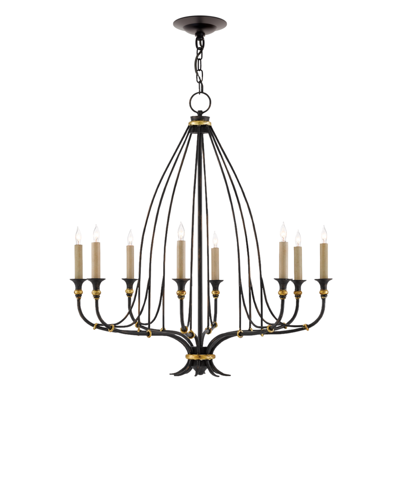 Not quite as sweeping as the larger fixture of the same name, the small version of the Folgate Chandelier has the same open form based upon influences as diverse as the frankness of the Federal style and the fluidity of French neoclassicism. The illumination flowing from the eight-light fixture will stir the air over a dining room table or a in a foyer. The wrought iron on the piece has been treated to a French black finish enlivened by gold leaf accents.