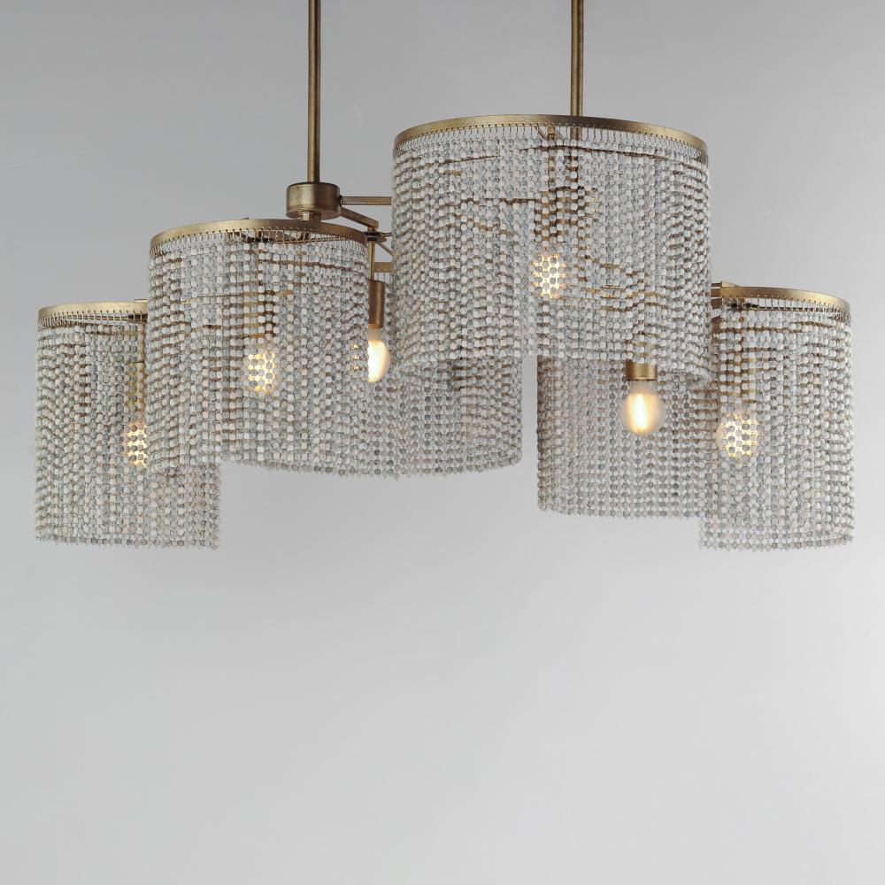 Cascading strands of square Weathered Wood beads are suspended on an offset spiraling frame finished in hand-applied Golden Silver leaf. The craftsmanship of the design is complimented by the soft glow of light within adding ambience to any space. Availabl