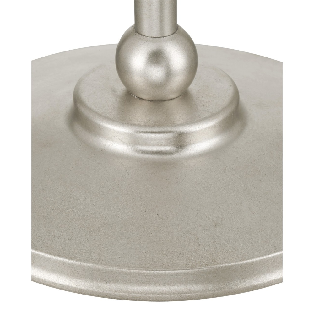 The Forget-Me-Not Silver Floor Lamp has sparkling floral accents with flowing buds made of crystals. Complementing the silver leaf finish, the sprays of crystal flow up from the thin stem to capture the illumination. The fixture is a functional piece and a work of art, as each crystal is hand-pinned. The reduced height of the drum shade, which is fastened to the fixture with a crystal finial, is an elegant touch for this two-light floor lamp.
