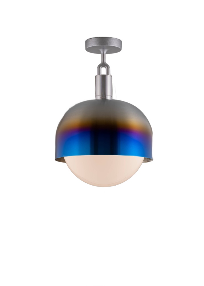 A ceiling light and shade, combining machined, hand-spun and cast solid metal, all refined by hand. It features our cast forked detailing and signature diamond-cut linear knurling. The light comes complete with a handblown opal glass globe and Forked-specific dimmable Buster Bulb, casting a functional ambient light in this configuration.