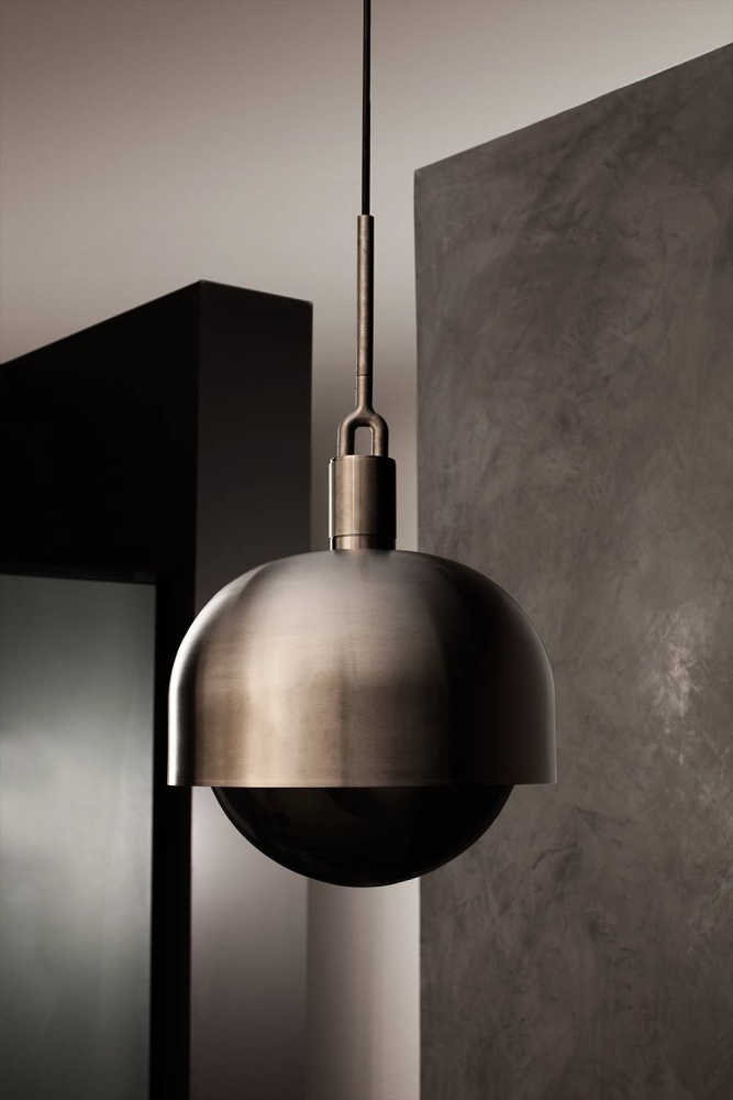 A light pendant and shade, combining machined, hand-spun and cast solid metal, all refined by hand. It features our cast forked detailing and signature diamond-cut linear knurling. The light comes complete with a handblown smoked glass globe and Forked-specific dimmable Buster Bulb, casting a soft decorative glow in this configuration.