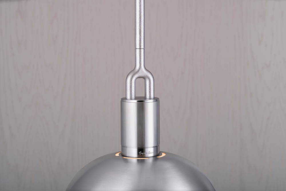 A light pendant and shade, combining machined, hand-spun and cast solid metal, all refined by hand. It features our cast forked detailing and signature diamond-cut linear knurling. The light comes complete with a Forked-specific dimmable Buster Bulb, casting a soft ambient light.