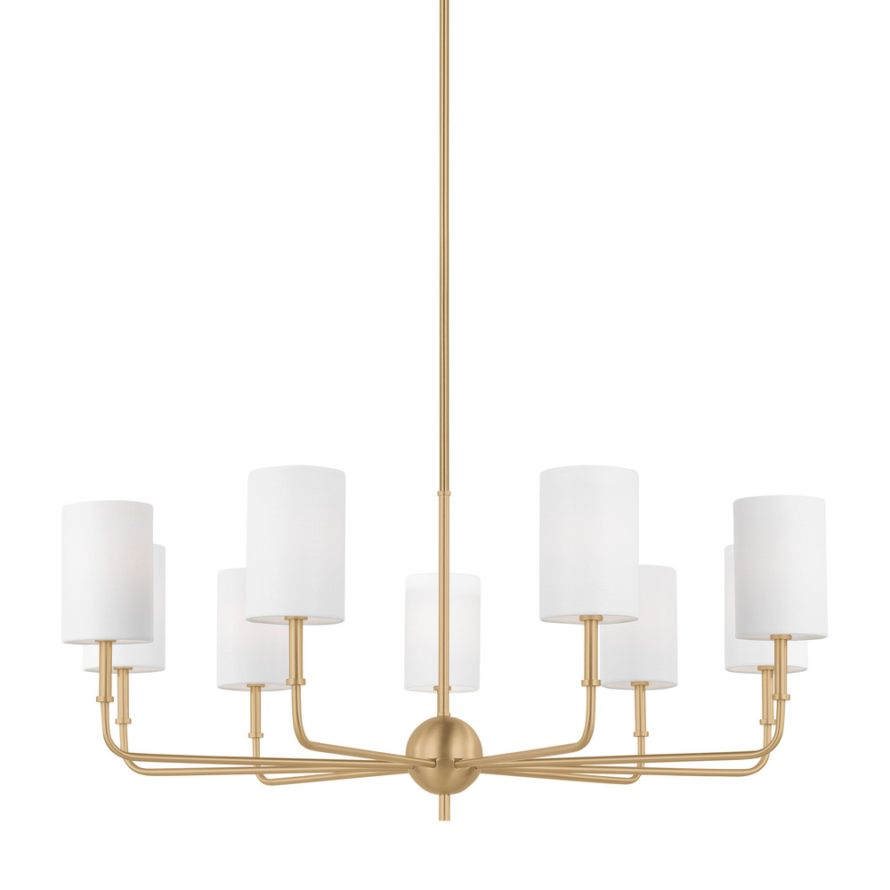 The Foxdale nine light single tier chandelier in Satin Brass encompasses the new traditional style with flawless execution. Refined and clean-lined, this classic silhouette is timeless without being stuffy. Perfectly transitional, this collection can be placed in any home regardless of style. Topped with White Linen Shades to complete the design.
