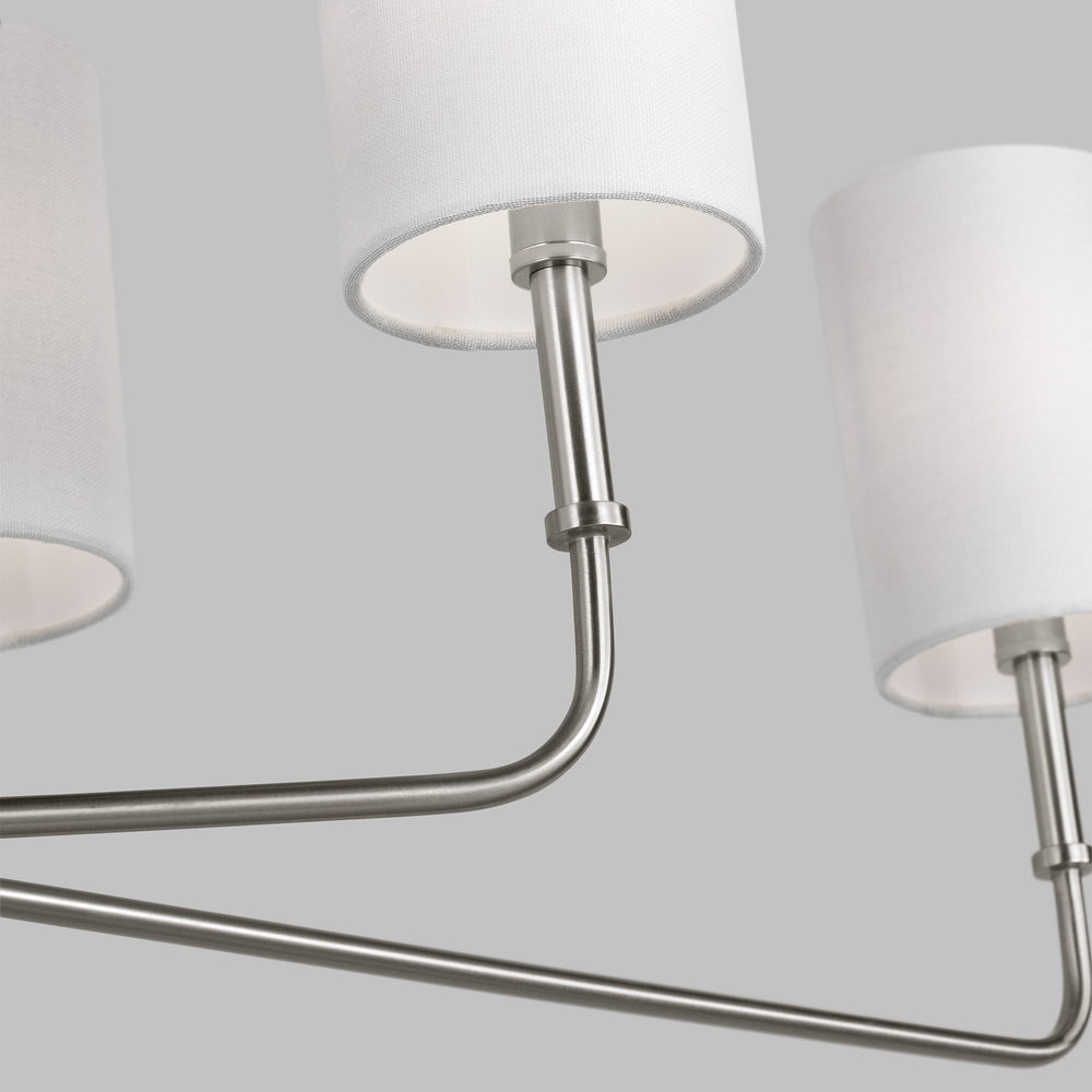 The Foxdale six light linear chandelier in brushed nickel silver encompasses the new traditional style with flawless execution. Refined and clean-lined, this classic silhouette is timeless without being stuffy. Perfectly transitional, this collection can be placed in any home regardless of style. Topped with White Linen Shades to complete the design.