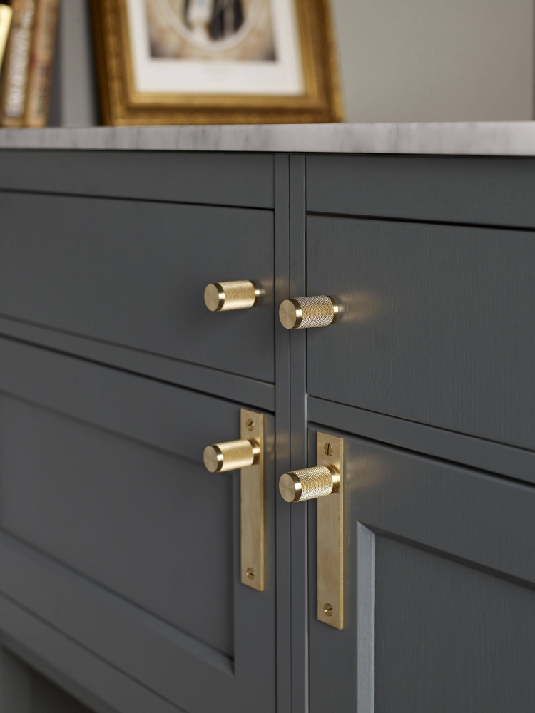 A pair of furniture knobs made from solid brass. These knobs feature our signature, diamond-cut, cross-knurl pattern and are refined by hand. They work great on cabinet doors, cupboards, kitchen units and just about anything that can open. Sold in sets of two.