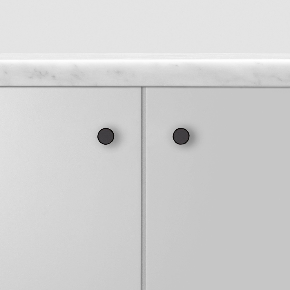 A pair of furniture knobs made from black anodised metal. These knobs feature our signature, diamond-cut, linear knurl pattern and are refined by hand. They work great on cabinet doors, cupboards, kitchen units and just about anything that can open. Sold in sets of two.