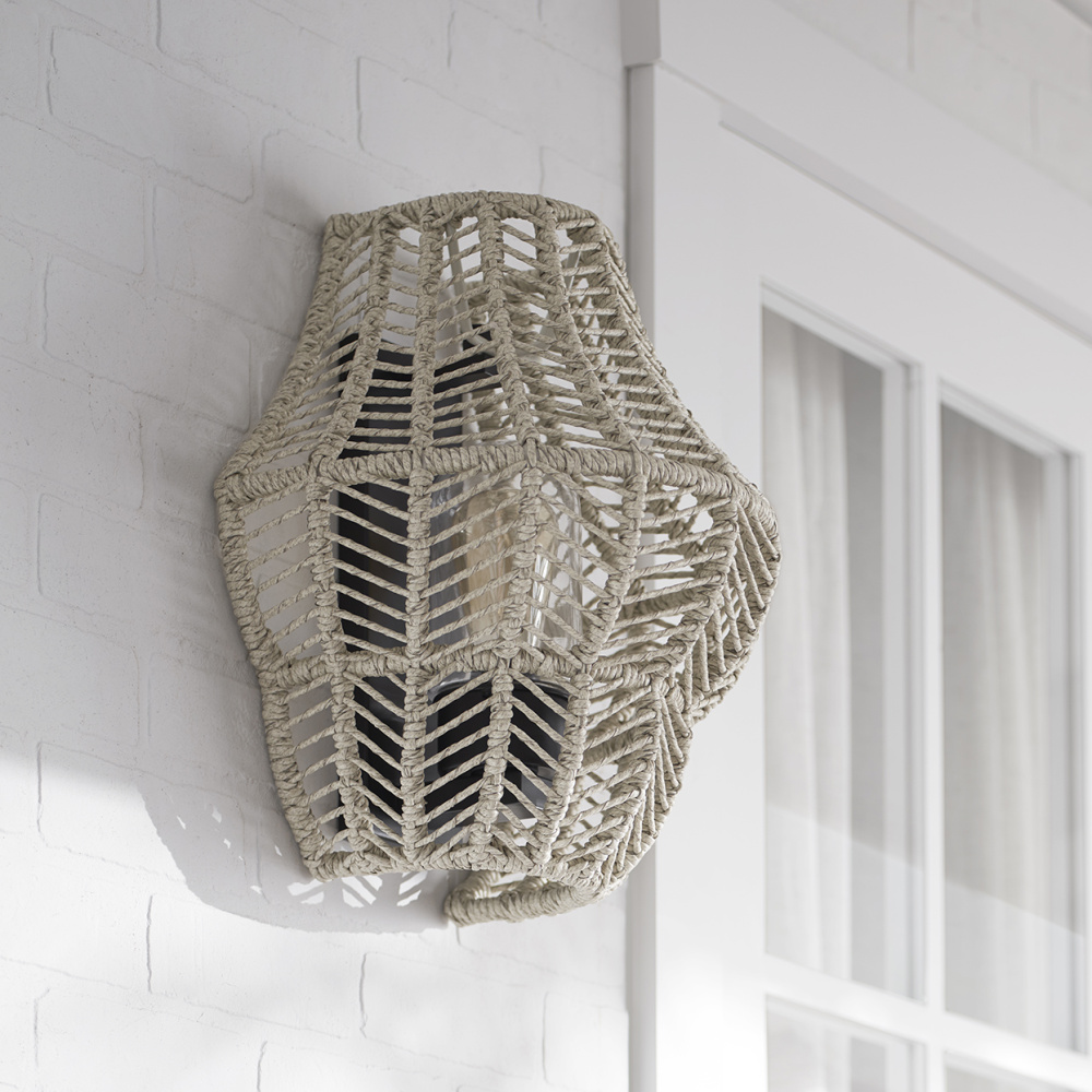 Hand-woven all-weather synthetic rattan in a whitewash finish intricately woven over a powder coated aluminum frame. Sconce comes with charcoal finished metal backplate. Suitable for outdoor use in a wet location. Professional installation recommended.