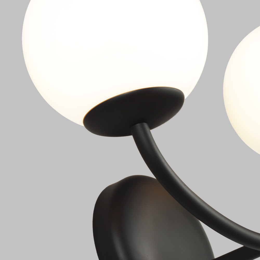 The Galassia two light wall sconce by AERIN in midnight black perfectly balances a glass globe and curving teardrop frame, giving it a contemporary look. The white glass casts a soft, welcoming glow over a space. This piece works particularly well in a hallway.
