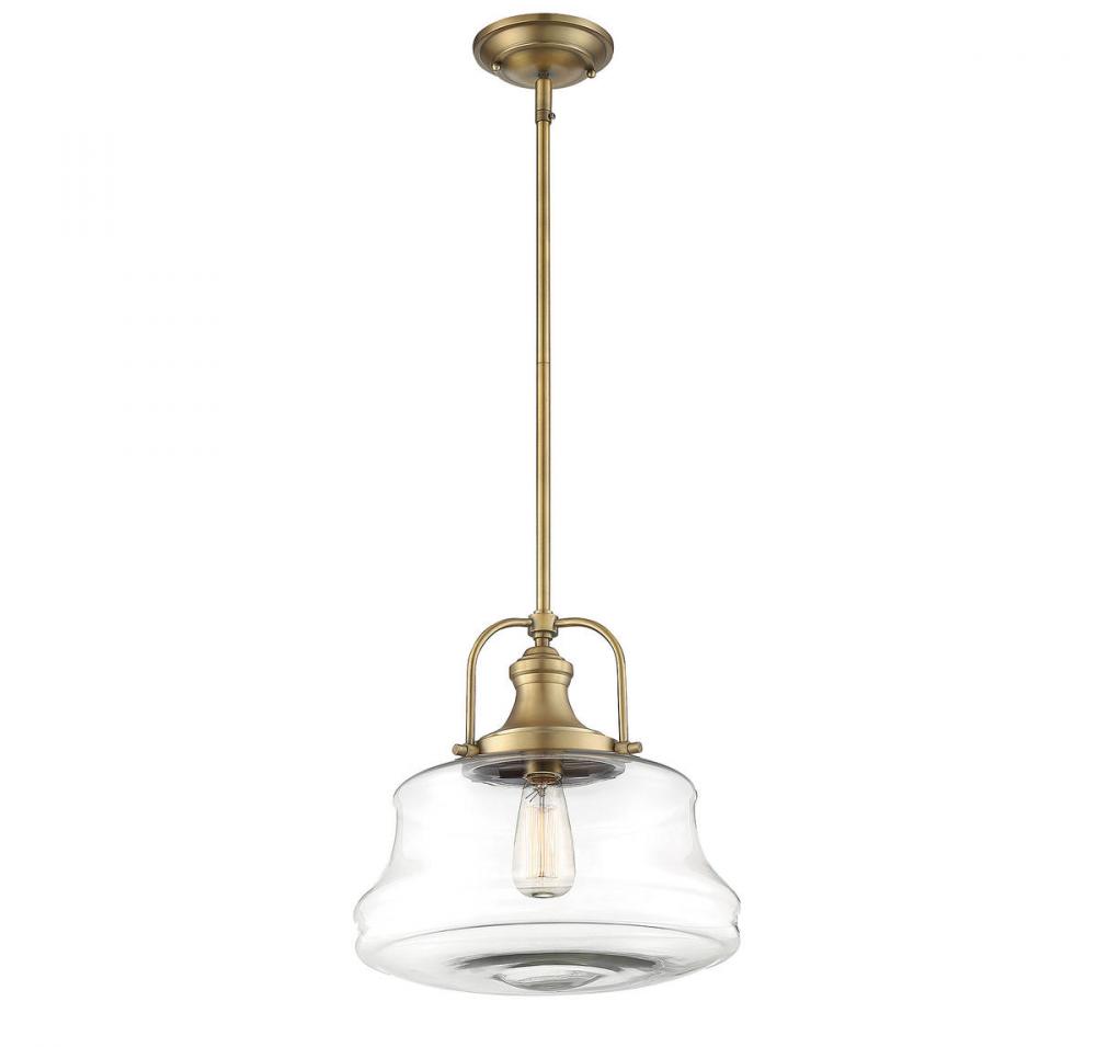 From Savoy House, the Garvey 1-light pendant puts a new spin on schoolhouse style. A curvy clear glass shade is paired with smart details, creating a look that is great for any space. Finished in warm brass. Pendants are extremely versatile and can fit in many different spaces, such as kitchens, family rooms, great rooms, foyers, entryways, offices, bedrooms and bathrooms. This pendant comes with three 9.5-inch downrods, so you can get the perfect hanging height for your needs, and it can be hung on a sloped ceiling. Bulb not included. You can pair Garvey with hardware finished in brass or mix it with hardware in other finishes. Its classic look fits well in vintage style rooms as well as transitional areas. When you choose a Savoy House lighting fixture, you can be certain you've selected a piece that will withstand the test of time.