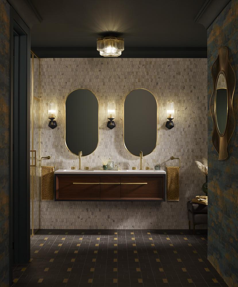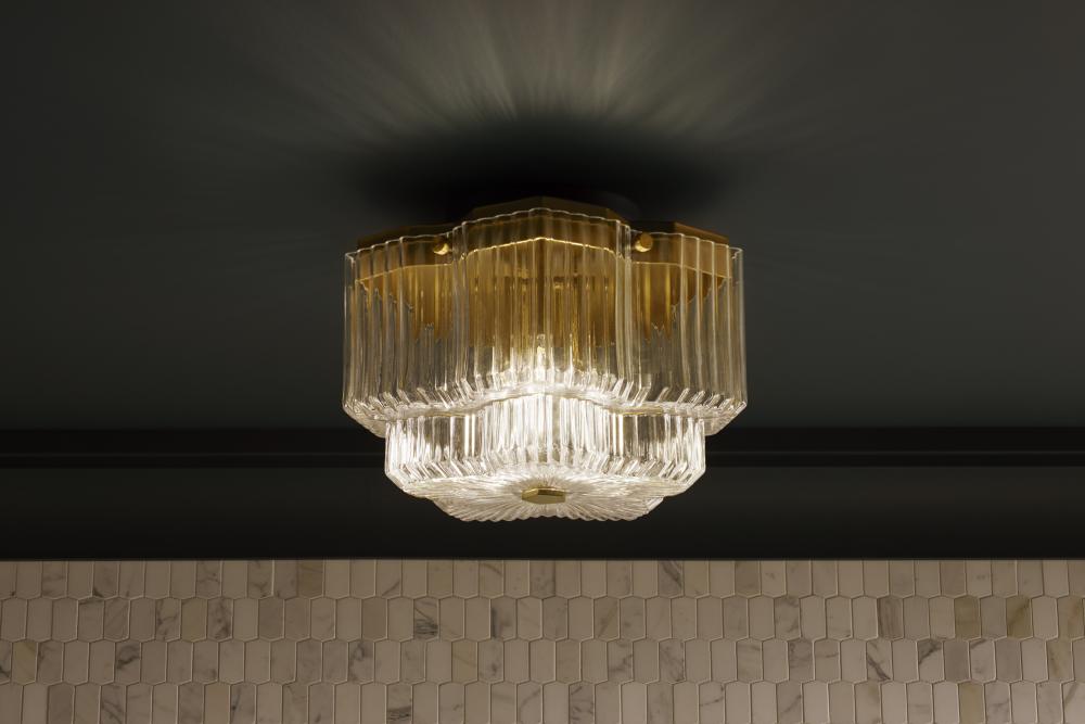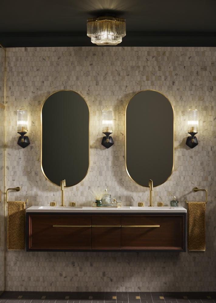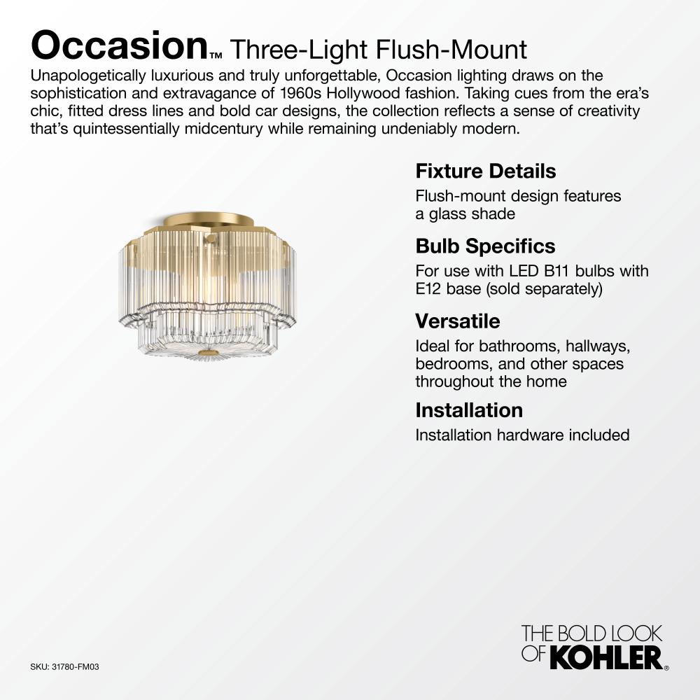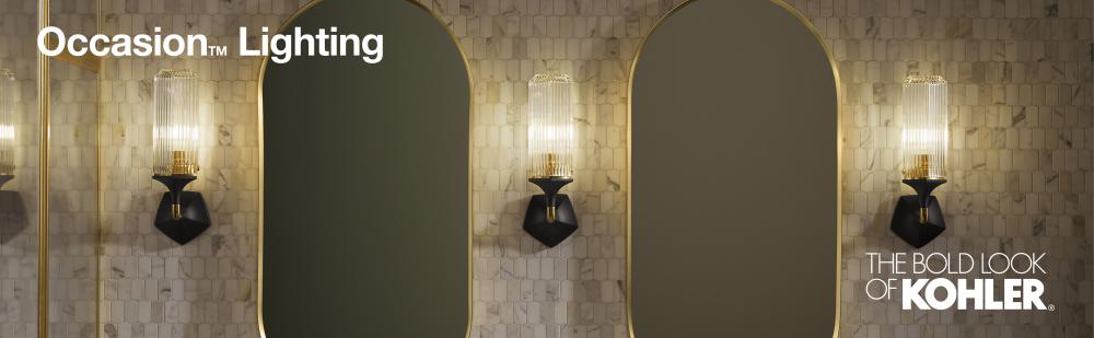 The Occasion lighting collection offers a modern rendition of 1960s Hollywood glamour across sconce, flush-mount, and pendant designs. Faceted metal bases and fluted cylindrical glass shades combine in centerpieces as elegant as they are functional. Like its Golden Age inspiration, the lighting collection evokes a vintage starlet charisma. Alluring and stylish, these statement pieces were created to complement the KOHLER Occasion faucet collection.