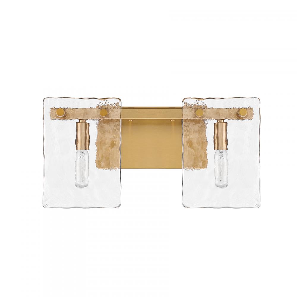 Bring a beautiful ocean-inspired lighting look to your home with the Savoy House Genry 2-light bath bar. It is decorated with rippling panes of handmade glass and finished in Warm Brass. Genry is 7.75" in height, 15.25" in width and extends 5.5" from the wall. It uses two candelabra size bulbs of up to 60 watts per bulb. Bulbs not included. This bath light is damp area rated and must be installed as shown.