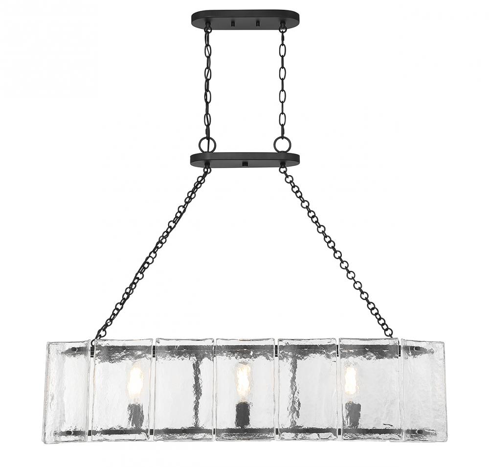 Bring a beautiful ocean-inspired lighting look to your home with the Savoy House Genry 3-light trestle. This linear design is decorated with rippling panes of handmade glass and finished in matte black. Genry is 31.5" in height, 41" in length and 13" in width. It uses 3 standard size bulbs of up to 60 watts per bulb (bulbs not included).