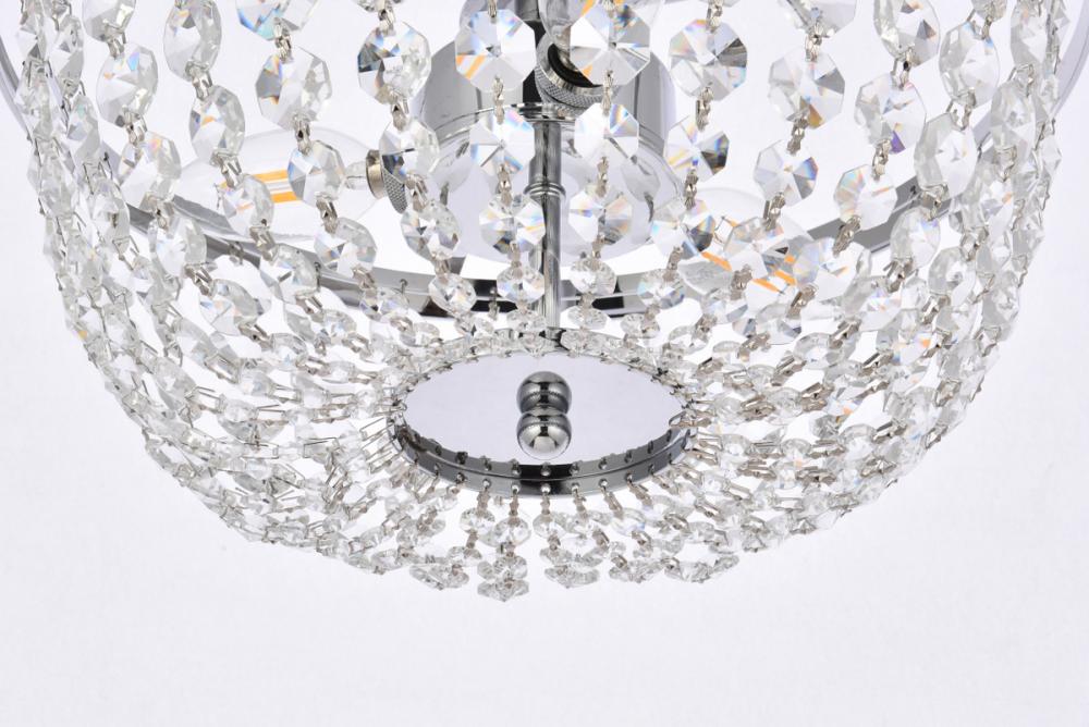Tiers of clear multi-faceted crystals reflect the soft glow of candelabra bulbs