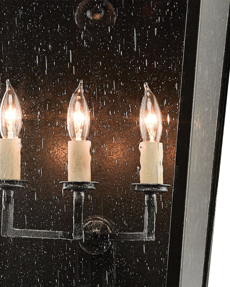 The large version of the Giatti Outdoor Wall Sconce is one of twelve fixtures in our Twelfth Street collection of outdoor lighting that features a Trilux finish, the next generation of high-performance, weather-resistant finishing technology brought to the market exclusively by Currey & Company. The coating provides three levels of protection, and is fade resistant, crack resistant and rust resistant. We guarantee the finishes applied to our Twelfth Street pieces for five years. The metal on this sconce in the collection has been treated to our midnight finish that surrounds seeded-glass panes that turn the illumination to a soft glow.