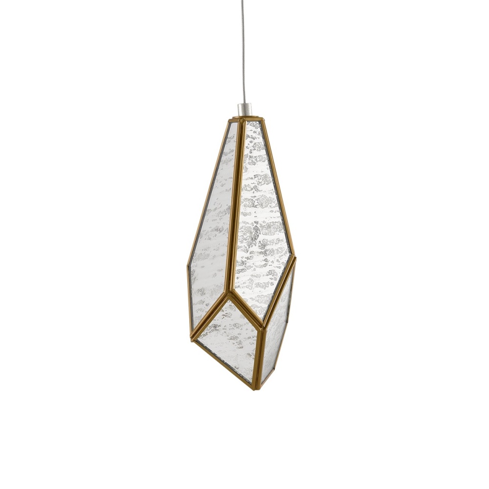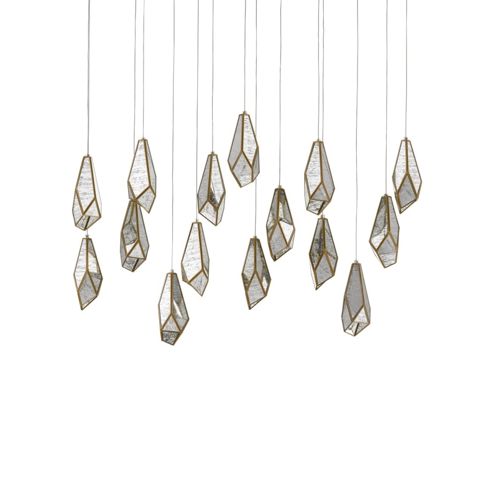The faceted shades of the Glace Rectangular 15-Light Multi-Drop Pendant are made of panes of Raj mirror joined with seams of metal in a brass finish. The organic shape of the shades and the fact they hang at differing heights brings this mirrored pendant added personality that will make it a piece of jewelry in a space. The canopy of this piece is luminous in a painted silver finish. This fixture is among Currey & Company's multi-drop pendant collection, which includes multiple configurations.