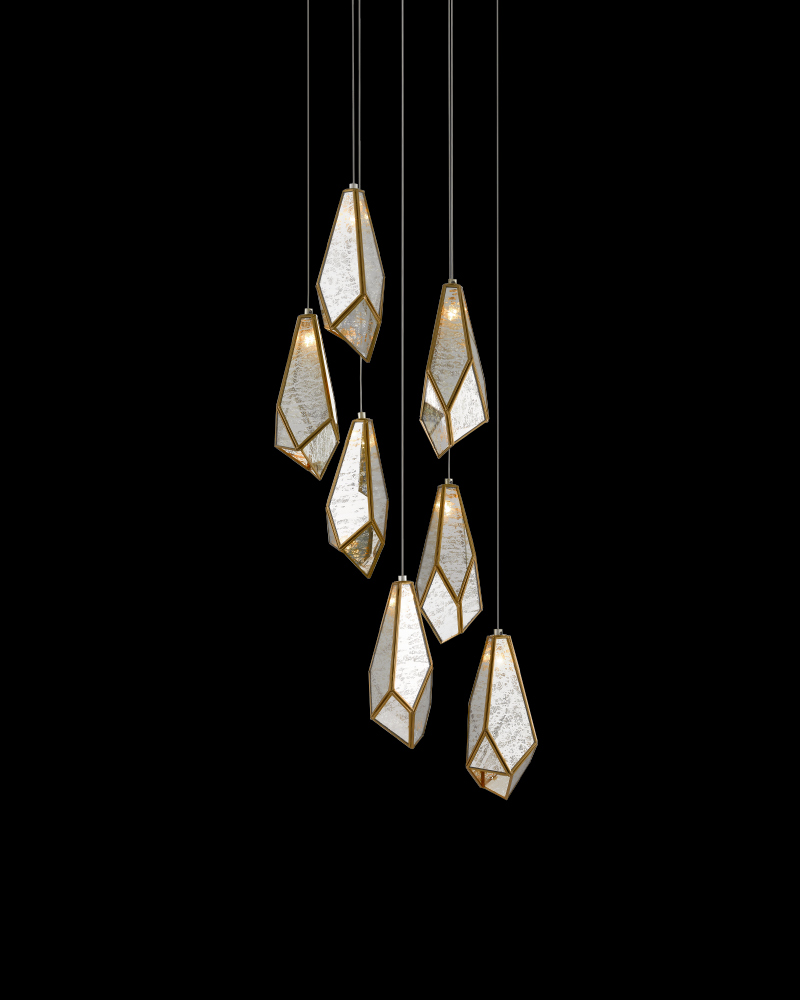 The faceted shades of the Glace 7-Light Multi-Drop Pendant are made of panes of Raj mirror joined with seams of metal in a brass finish. The organic shape of the shades and the fact they hang at differing heights brings this mirrored pendant added personality that will make it a piece of jewelry in a space. The canopy of this piece is luminous in a painted silver finish. This fixture is among Currey & Company's multi-drop pendant collection, which includes multiple configurations.