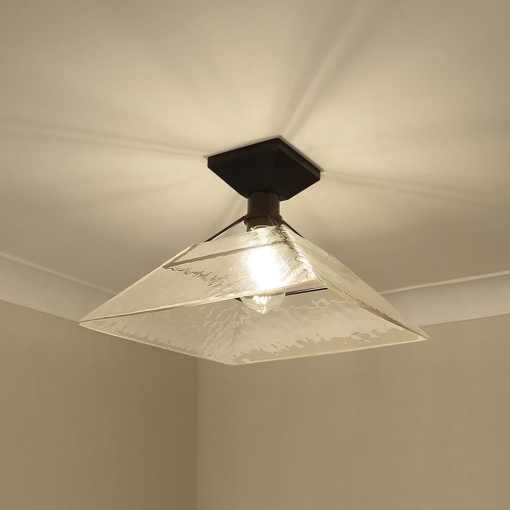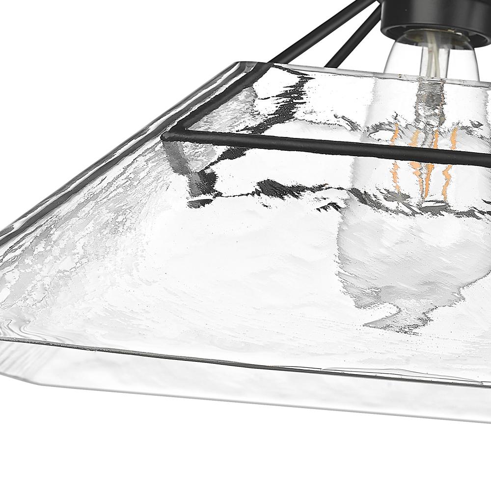 Bring modern elegance into your home with the Golden Lighting Kepler 1-light Semi-Flush Mount. Featuring a glass shade and a matte black frame, it creates a welcoming atmosphere. The water glass shade produces a shimmering, water-like refractive effect, beautifully catching and refracting light to create a dappled glow. The matte black finish epitomizes clean, modern style, offering a timeless appeal that complements any decor. Suitable for entryways, bedrooms, kitchens, and living areas with mid-height ceilings, this fixture is damp location rated for spaces with occasional moisture like bathrooms and covered porches. Overall dimensions are 14"W x 9.88"H x 14"D, and it requires 1 E26 Medium base bulb (not included), max 100 wattage. Add the Kepler fixture to your home for a stylish lighting solution that enhances both form and function.
